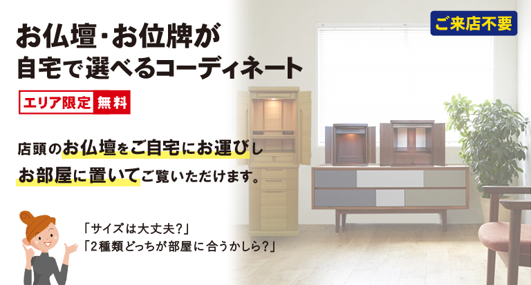 店頭のお仏壇をご自宅にお運びし、実際にお部屋に置いてご覧いただけるサービスです。
