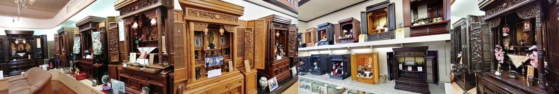 経済産業大臣が認定した東京都の伝統工芸品41品目の内の1つ「東京仏壇」の小型~大型、家具調~伝統型仏壇を多数展示