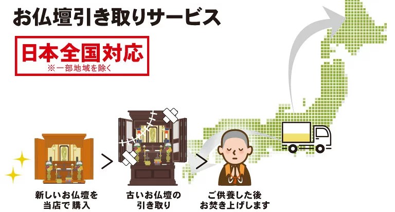 当ショップにてお仏壇をご購入のお客様に限り、地域限定にて今まで使用していた古いお仏壇の引取りを無料で致します。