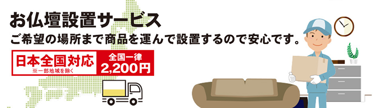インターネットでお仏壇を買っても通常は玄関でのお渡しとなります。こちらのサービスは、配送スタッフがご希望の場所まで商品を運んで設置するので、一人暮らしの方やご年配の方でも安心してご注文いただけます。