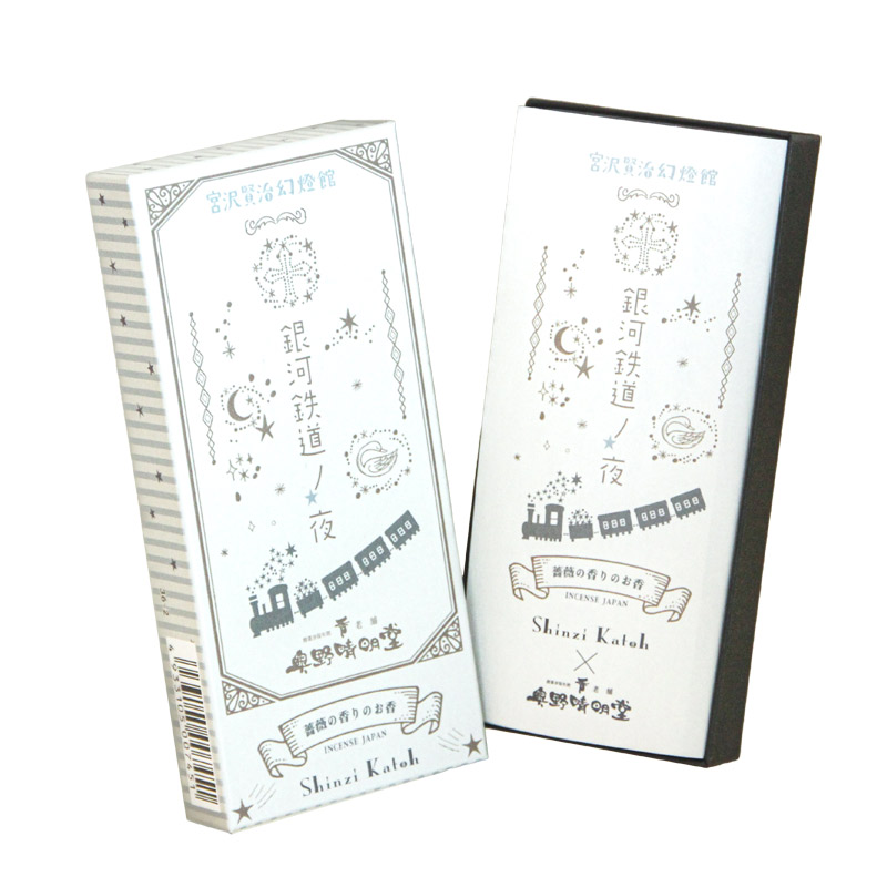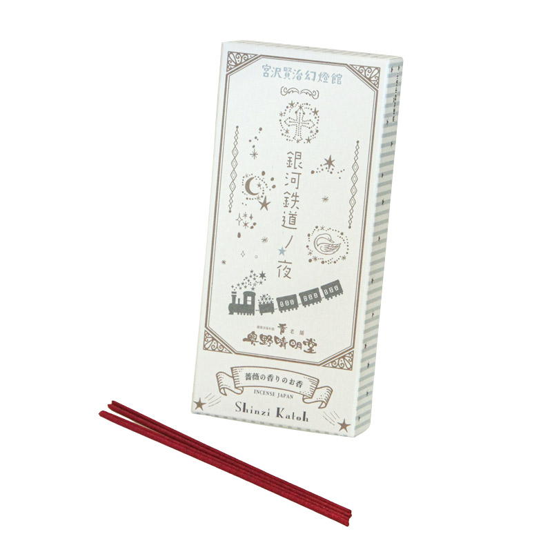 | 商品説明 | 【商品コード:3456】 【商品詳細】 ●内容量:約50g ●本数:120本 ●燃焼時間 約30分 けむり:ふつう ●パッケージサイズ 高さ16cm×長さ7.2cm×奥行2.4cm ※燃焼時間は、場所・気候(室内状態)により変化致します。 宮沢賢治の代表作「銀河鉄道の夜」の世界観を柔らかなホワイトと夜空に浮かぶ星座のイラスト印象的なパッケージのお線香。 作中にも薔薇の香りという表現が登場し、お線香から香る薔薇の香りはまるで「銀河鉄道の夜」の世界に入り込んだよう 薔薇の香りに満たされ、宮沢賢治の作品世界に満たされたひと時をお楽しみください。 |