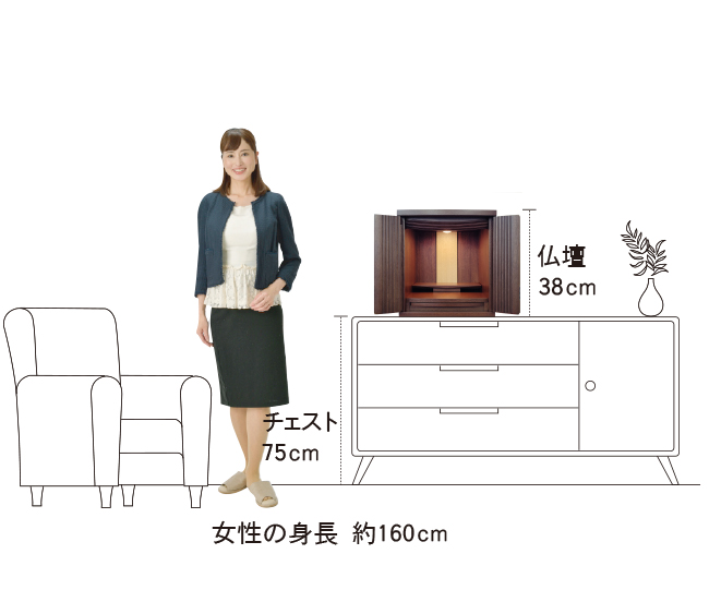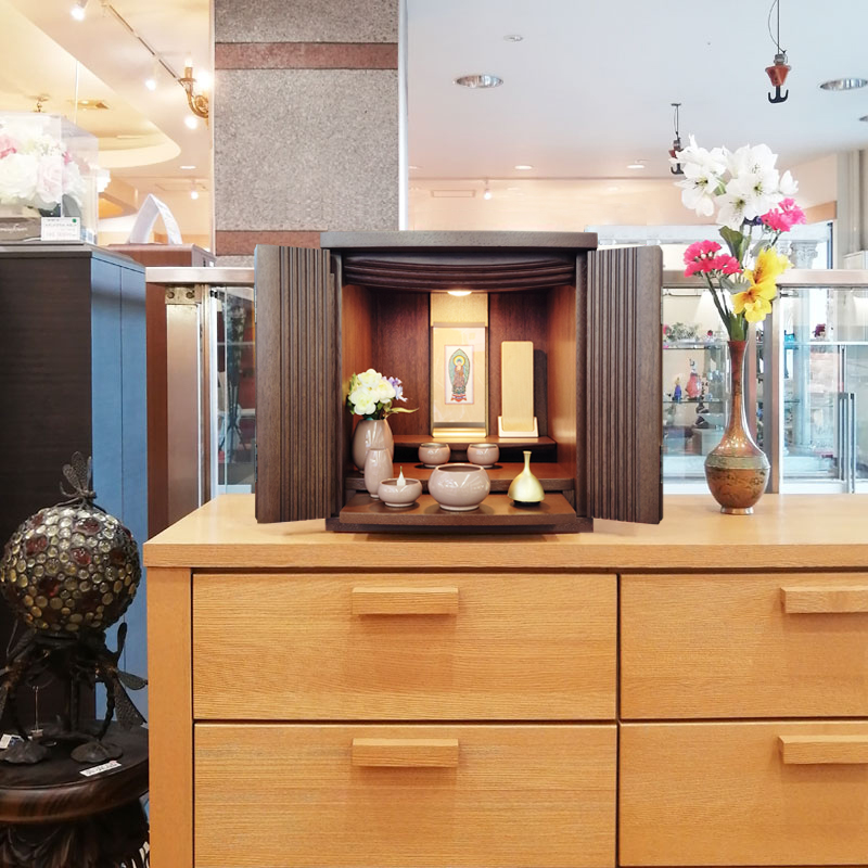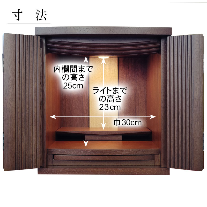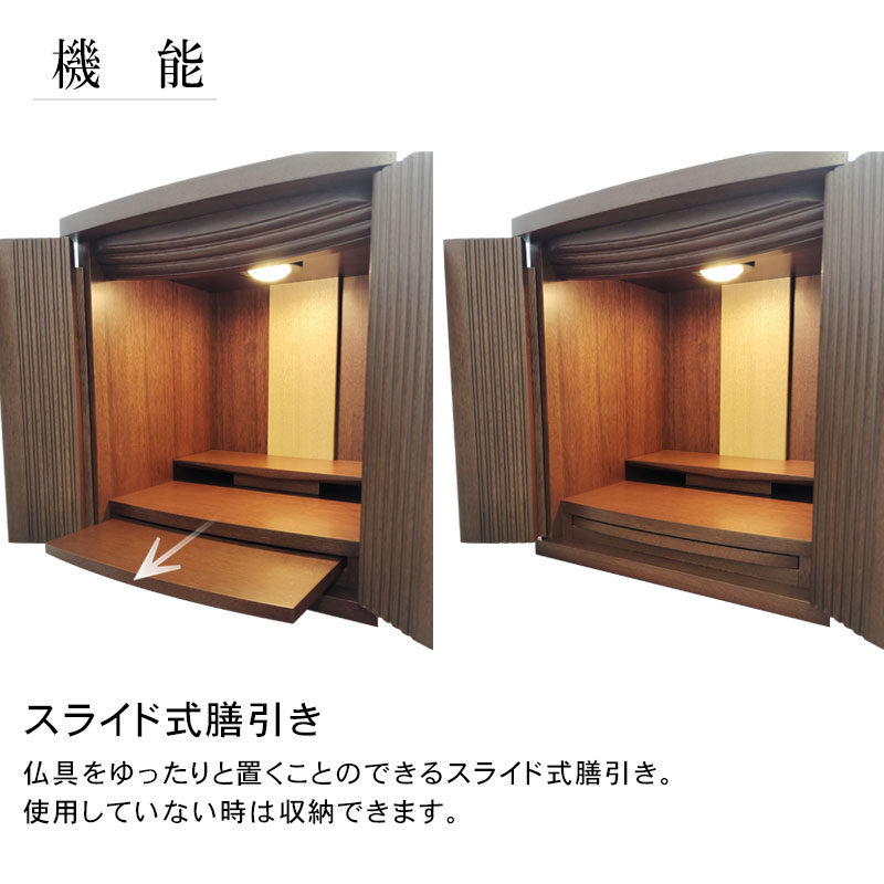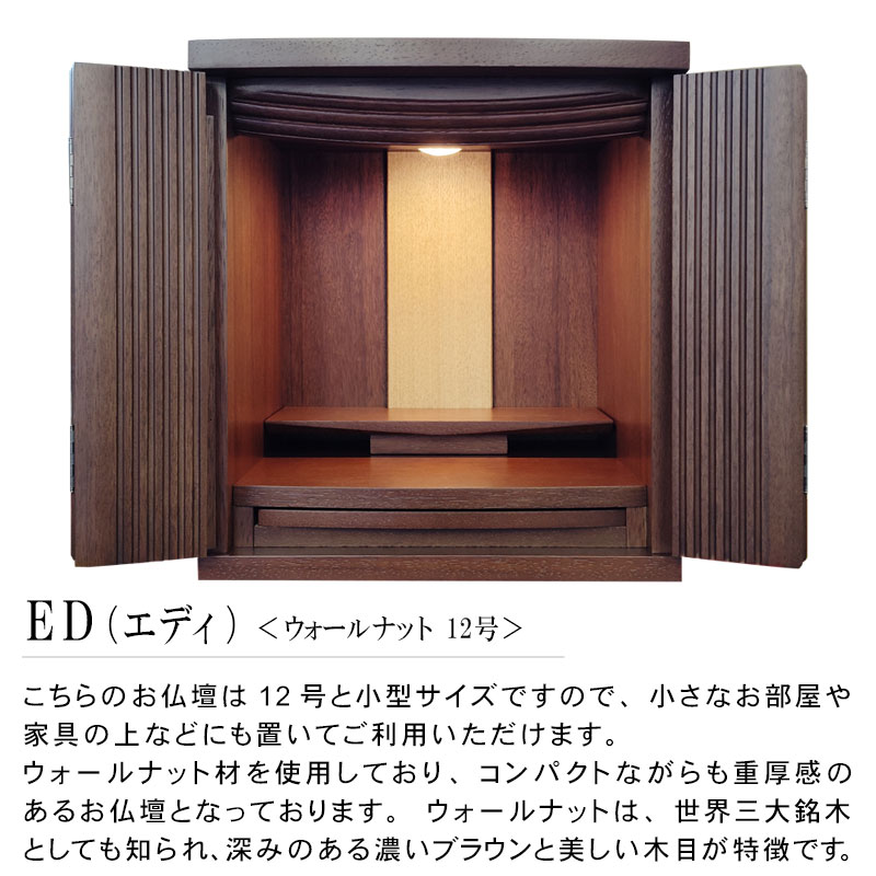 | 商品説明 | 【商品コード:00】 ■材質詳細 ・笠、台輪/主材料:ウォールナット 芯材料:MDF ・戸板、扉/主材料:ウォールナット 芯材料:MDF ・その他/表面仕上げ:ウレタン、生産地:海外 ■宗派 どの宗派でもお使いいただけます。 ■備考 ・商品は手作りの為、一部の色、デザイン、寸法が多少変更になる場合がございます。 こちらのお仏壇は12号と小型サイズですので、小さなお部屋や家具の上などにも置いてご利用いただけます。 ウォールナット材を使用しており、コンパクトながらも重厚感のあるお仏壇となっております。ウォールナットは、世界三大銘木としても知られ、深みのある濃いブラウンと美しい木目が特徴です。高級感ある深い色合いは、家具はもちろん建材や楽器など幅広い分野で人気の材料となっております。 扉中央部分には、縦のラインを施した丸みのある厚さの異なる板を使用し立体感のあるデザインとなっております。 須弥壇は取外し可能で、ご本尊様やお位牌の高さによって自由に調節していただけます。 仏具をゆったりと置くことのできるスライド式膳引き。使用していない時は収納できます。 内部照明には、LEDライトを採用しております。長寿命で消費電力が少なく、紫外線による商品の退色や赤外線による熱的ダメージを軽減することができます。 |