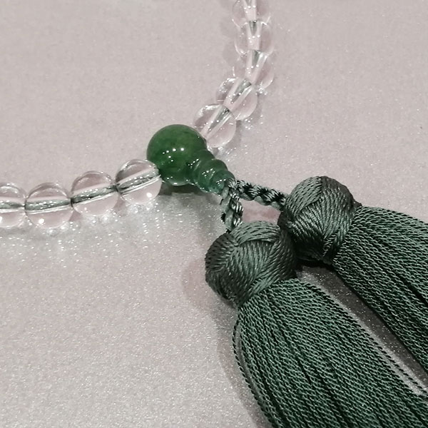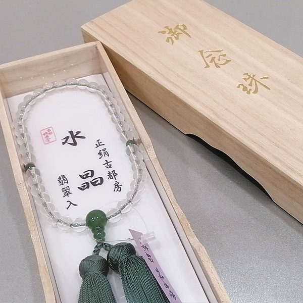 | 商品説明 | 【商品コード:2197】 ■珠の素材 ●主珠:水晶(約7mm) ●親珠:翡翠(約10mm) ●天珠:翡翠(約5mm) ■房の素材 ●正絹古都房(房、通し糸共正絹) ■特徴 主珠に水晶、親珠、天珠に翡翠をアクセントとして使った女性用の数珠です。 水晶はクリスタルとも呼ばれ、無色透明な石で、日本の国石(象徴石)にも選ばれています。 翡翠は、深緑の半透明な宝石の一つで、東洋(中国)、中南米(アステカ文明)では古くから人気が高い宝石で、金以上に珍重されていました。その豊富な色の原石が、美しい「翡翠」(カワセミ)をイメージさせることから「翡翠玉」と呼ばれるようになり、その名前が中国から日本へと伝わってきたとされています。 翡翠の歴史では日本が最も古く、縄文時代から勾玉として使用されてきました。中国でも「玉(ぎょく)」と呼ばれ、古来より王の象徴として特別に扱われてきました。 水晶の透明な輝きに、翡翠の落ち着いた優しい色合いが高級感と上品さを感じさせる美しい仕上がりになっております。 古都房には高級素材の正絹を使用しており京都の数珠職人が匠の技で仕立てた逸品でございます。 数珠は、寿珠とも言われ縁起のいいプレゼントとして、成人式や就職祝いなどに贈られることが多いようです。 進物用の商品につきましては、包装をしてお届けいたします。 「志」「御祝」などの、のし紙も無料でお付けすることができます。 包装やのし紙をご希望の方は、お客様情報入力ページの「ご連絡事項」欄にご記入ください。 ■宗派 どの宗派でもお使いいただける片手略式数珠です。 ■備考 ●数珠は桐箱入り(桐箱は防腐成分や虫よけの成分を含み、湿気予防にも最適です。保管の際は、防虫剤を一緒に入れると虫食い予防になります。) ●天然素材のため商品には若干の差があります。 |
