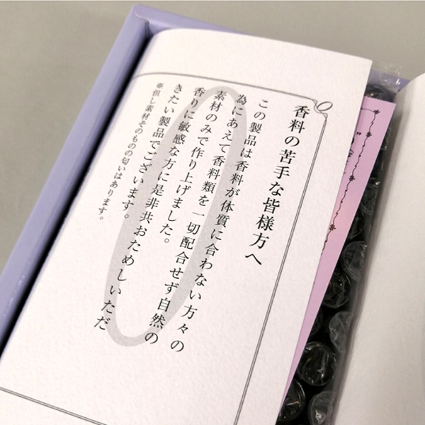 | 商品説明 | 【商品コード:2221】 ■商品詳細 ●内容量:約170g ●お線香の長さ:約14cm ●燃焼時間:約30分(煙の少ないタイプ) ●パッケージサイズ 長さ16.5cm×幅10cm×高さ4cm ※燃焼時間は、場所・気候(室内状態)により変化致します。 煙の少ない無香料のお線香です。 香料が体質に合わない方の為に、あえて香料類を一切配合せず自然の素材のみでつくりました。そのため香りも自然で素材の香りのみが残ります。 香料の苦手な方、香りに敏感な方にお試しいただきたいお線香です。 また、集合住宅で香り・煙が気になり、お線香を焚けなかったという方にもお薦めできるお線香です。 ※自然素材そのものの匂いはございます。 |