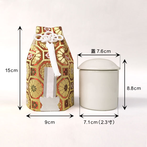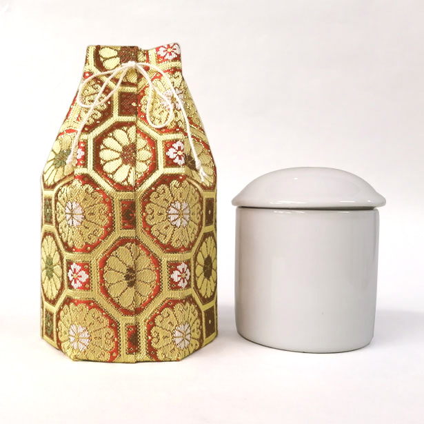 | 商品説明 | 【商品コード:2238】 ■商品詳細 「分骨つぼ」 ●材質:陶器製 ●外寸サイズ:直径7.6cm、高さ8.8cm 「収納袋」 ●材質:布、厚紙 ●外寸サイズ:直径9cm、高さ15cm 手元供養・分骨などに最適なコンパクトサイズの陶器製骨壺と袋のセットです。 骨壷を入れる袋は、六角で素材自体に厚みがあり、しっかりとした作りになっています。 後ろの紐を解いて上から骨壷を入れてください。再び紐を結ぶだけでOKです。 正面には飾り結びが端正な印象を与える、白房が付いております。 本山や菩提寺に分骨を納めるとき、手元供養などご自宅に置いておくときに分骨つぼを使います。 小動物などのペット用としてもご利用いただけます。 |