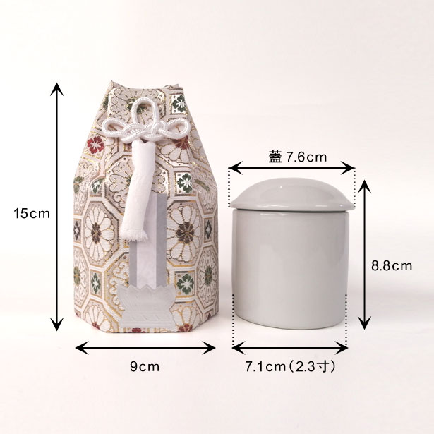 | 商品説明 | 【商品コード:2240】 ■商品詳細 「分骨つぼ」 ●材質:陶器製 ●外寸サイズ:直径7.6cm、高さ8.8cm 「収納袋」 ●材質:布、厚紙 ●外寸サイズ:直径9cm、高さ15cm 手元供養・分骨などに最適なコンパクトサイズの陶器製骨壺と袋のセットです。 骨壷を入れる袋は、六角で素材自体に厚みがあり、しっかりとした作りになっています。 後ろの紐を解いて上から骨壷を入れてください。再び紐を結ぶだけでOKです。 正面には飾り結びが端正な印象を与える、白房が付いております。 本山や菩提寺に分骨を納めるとき、手元供養などご自宅に置いておくときに分骨つぼを使います。 小動物などのペット用としてもご利用いただけます。 |