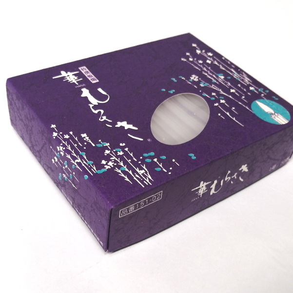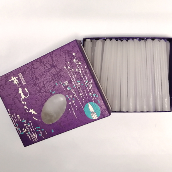 | 商品説明 | 【商品コード:2252】 ■商品詳細 ●内容量 : 50本 ●標準燃焼時間:約1時間 ●サイズ:約0.8×9cm この「華むらさき」は、点火するとローソク外側に形取られたギザギザが花びらをイメージさせるように残り、自然に数枚の花びらが開花するように燃焼し始めます。 それぞれの花びらが、お互いをしっかりと支え合いながら安定した炎を形づくりススけず、流れず、完全燃焼します。 ローソクは灯の安定が良く、紫の花心が気品を感じさせます。 |