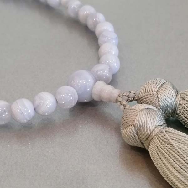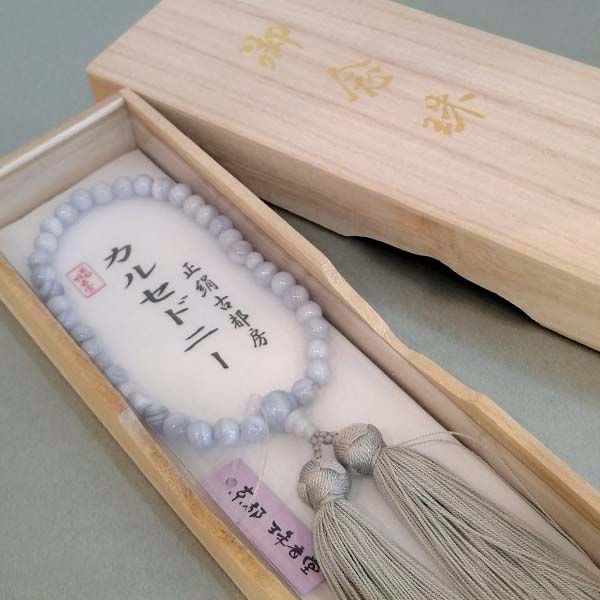 | 商品説明 | 【商品コード:2256】 ■珠の素材 ●主珠:カルセドニー(約7mm) ●親珠:カルセドニー(約10mm) ●天珠:カルセドニー(約5mm) ■房の素材 ●正絹古都房(房、通し糸共正絹) ■特徴 主珠、親珠、天珠にカルセドニーを使った女性用の数珠です。 淡い水色の天然石の表面には穏やかな波模様が現れており、女性らしい柔らかな色合いが品の良さを感じさせてくれます。 カルセドニーは水晶と同じ石英グループの一種で、和名では玉髄(ぎょくずい)といいます。 独特の優しさや色合いが昔から親しまれてきた女性に人気の数珠となっております。 頭付松房には高級素材の正絹を使用しており京都の数珠職人が匠の技で仕立てた逸品でございます。 数珠は、寿珠とも言われ縁起のいいプレゼントとして、成人式や就職祝いなどに贈られることが多いようです。 進物用の商品につきましては、包装をしてお届けいたします。 「志」「御祝」などの、のし紙も無料でお付けすることができます。 包装やのし紙をご希望の方は、お客様情報入力ページの「ご連絡事項」欄にご記入ください。 ■宗派 どの宗派でもお使いいただける片手略式数珠です。 ■備考 ●数珠は桐箱入り(桐箱は防腐成分や虫よけの成分を含み、湿気予防にも最適です。保管の際は、防虫剤を一緒に入れると虫食い予防になります。) ●天然素材のため商品には若干の差があります。 |