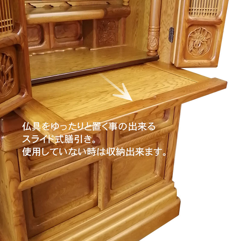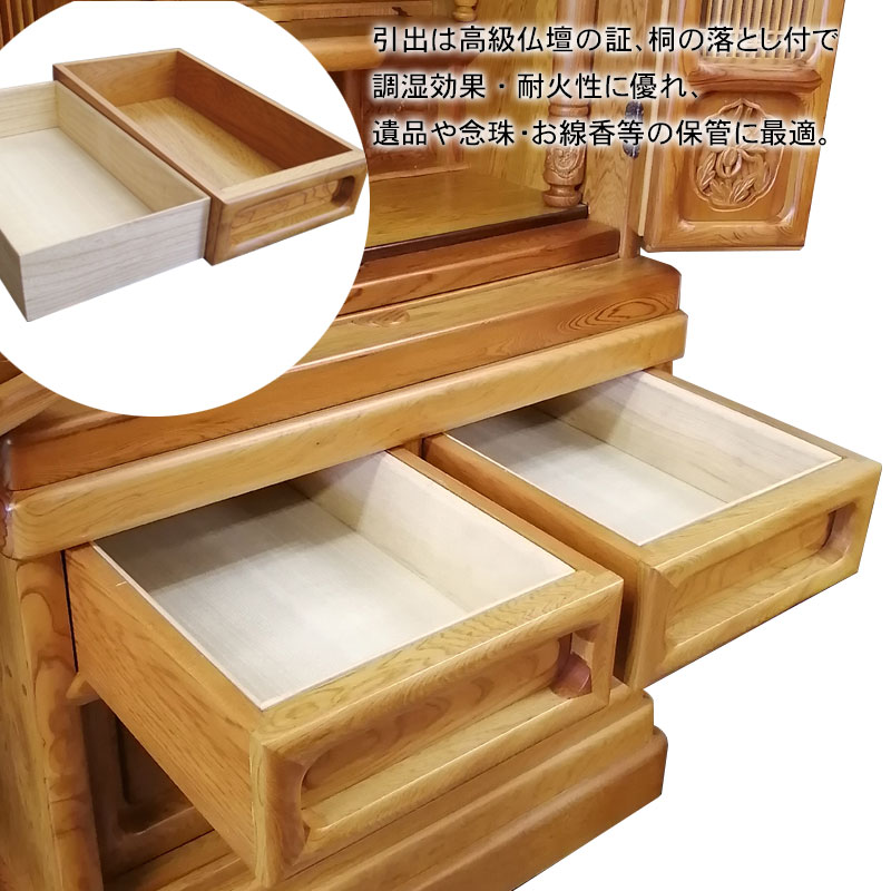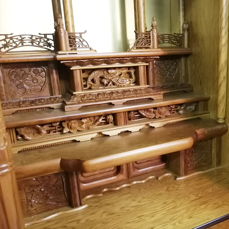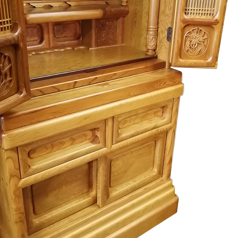 | 商品説明 | 【商品コード:1002】 ■材質詳細 ・笠、台輪/主材料:屋久杉無垢 芯材料:屋久杉無垢 ・戸板、扉/主材料:屋久杉無垢 芯材料:屋久杉無垢 ・大戸軸/主材料:屋久杉厚板貼り 芯材料:朴 ・その他/表面仕上げ:摺漆仕上げ、生産地:日本 ■宗派 どの宗派でもお使いいただけます。 ■備考 ・商品は手作りの為、一部の色、デザイン、寸法が多少変更になる場合がございます。 こちらのお仏壇は国の特別天然記念物に指定されている希少材の屋久杉を使用した伝統芸仏壇でございます。 屋久杉は鹿児島県屋久島にて樹齢千年以上の樹木に与えられる称号で、同じ屋久島にある杉材でもその樹齢により名称が変わる木材です。また、特別天然物指定を受けている木材なので、伐採することは許されておらず自然倒木したものだけが製材され市場に出荷されるため安定供給することが不可能なため希少材とされています。 近年の異常気象による超大型台風などの影響で樹齢千年を待たずして倒木してしまうものもあり、屋久杉の稀少性は今後更に上がるとされております。 こちらのお仏壇はその稀少な屋久杉材の無垢・厚板を贅沢に使用したお仏壇です。 造りは外欄間障子付の角型で、明るい色調の屋久杉材を使用していることにより、和洋お部屋を選ばずご安置するとが可能になっております。また、東洋画で古代より草木の中の君子と称えられる4種の草木(蘭・竹・菊・梅)が施された四君子彫仕上げになっております。 こちらのお仏壇も東京都の伝統工芸技術である江戸指物技術にて製作され、仕上げに摺漆仕上げを施してあります。 伝統工芸士により製作される伝統工芸仏壇は本体に東京都指定伝統工芸仏壇であることを証するシリアルナンバー入りの証紙が貼付されております。 【東京仏壇:東京都伝統工芸品東京仏壇とは】 東京仏壇の歴史は、1603年に徳川家康が江戸に開府したことにはじまります。宗教政策の一環として仏寺の建立発展を進めた結果、八代将軍吉宗の時代には一般庶民が競って仏壇を祀るようになりました。その需要に応えるべく、江戸指物師や仏師が独自の技法をつぎこみ仏壇をこしらえたのが、東京仏壇の原型です。 その後、1840年ころからは東京仏壇に唐木が使われるようになり、木地本来の持ち味を生かしながら古典的な優美さも残した、丈夫で長持ちする実用本位の仏壇がつくられます。この伝統と技術を受け継いだ職人(伝統工芸士)が丹念に手づくりしたものが、現在わたしたちが目にする東京仏壇なのです。 現在、東京都伝統工芸品東京仏壇には伝統工芸品である証の伝産マークとシリアルナンバーが記された証紙(シール)が貼付されております。お求めの際はこの証紙をお確かめの上、類似品にはご注意ください。 |