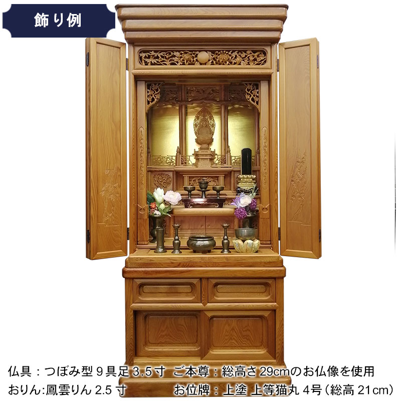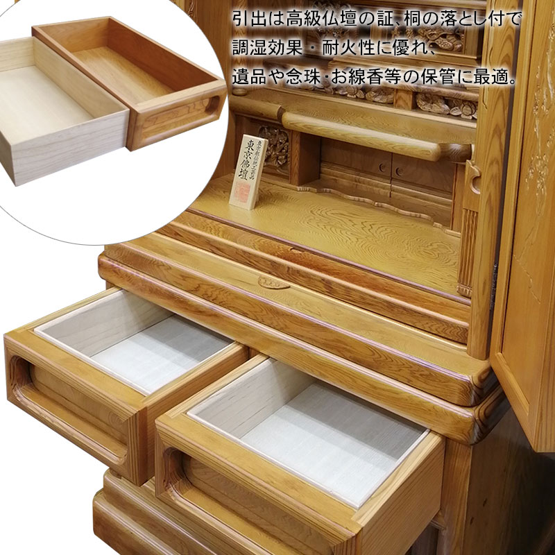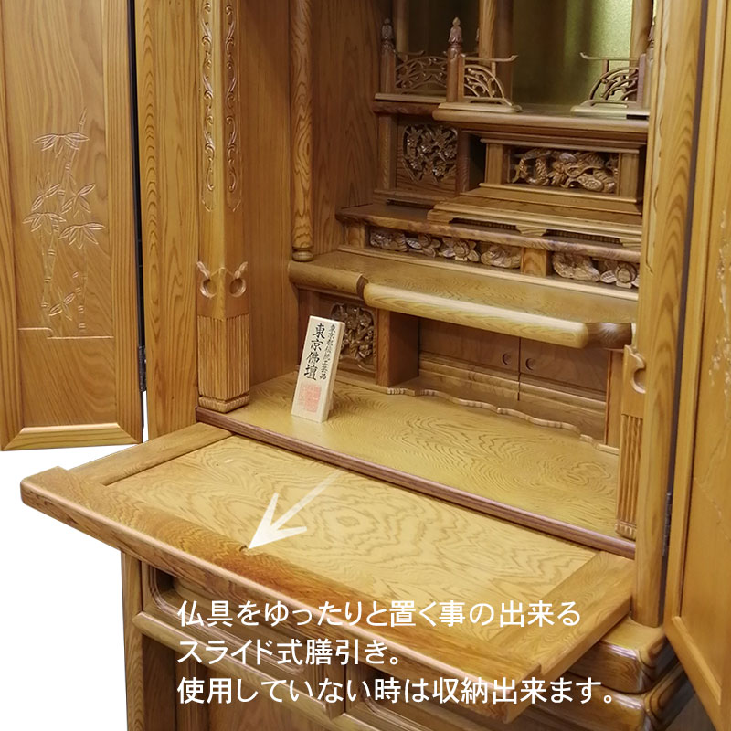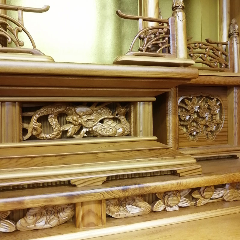| 商品説明 | 【商品コード:2469】 ■材質詳細 ・笠、台輪/主材料:屋久杉無垢 芯材料:屋久杉 ・戸板、扉/主材料:屋久杉無垢 芯材料:屋久杉 ・大戸軸/主材料:屋久杉厚板貼り 芯材料:朴 ・その他/表面仕上げ:摺漆仕上げ、生産地:日本 ■宗派 どの宗派でもお使いいただけます。 ■備考 ・商品は手作りの為、一部の色、デザイン、寸法が多少変更になる場合がございます。 お仏壇の日本堂では東京都指定伝統工芸仏壇を取り扱っております。 こちらのお仏壇は国の特別天然記念物に指定されている希少材の屋久杉を使用した伝統芸仏壇でございます。 東京都の伝統工芸技術である江戸指物技術にて製作され、仕上げに精製漆の摺漆仕上げをを施してあります。 伝統工芸士により製作される伝統工芸仏壇は本体に東京都指定伝統工芸仏壇であることを証するシリアルナンバー入りの証紙が貼付されております。 【東京仏壇:東京都伝統工芸品東京仏壇とは】 東京仏壇の歴史は、1603年に徳川家康が江戸に開府したことにはじまります。宗教政策の一環として仏寺の建立発展を進めた結果、八代将軍吉宗の時代には一般庶民が競って仏壇を祀るようになりました。その需要に応えるべく、江戸指物師や仏師が独自の技法をつぎこみ仏壇をこしらえたのが、東京仏壇の原型です。 その後、1840年ころからは東京仏壇に唐木が使われるようになり、木地本来の持ち味を生かしながら古典的な優美さも残した、丈夫で長持ちする実用本位の仏壇がつくられます。この伝統と技術を受け継いだ職人(伝統工芸士)が丹念に手づくりしたものが、現在わたしたちが目にする東京仏壇なのです。 現在、東京都伝統工芸品東京仏壇には伝統工芸品である証の伝産マークとシリアルナンバーが記された証紙(シール)が貼付されております。お求めの際はこの証紙をお確かめの上、類似品にはご注意ください。 |