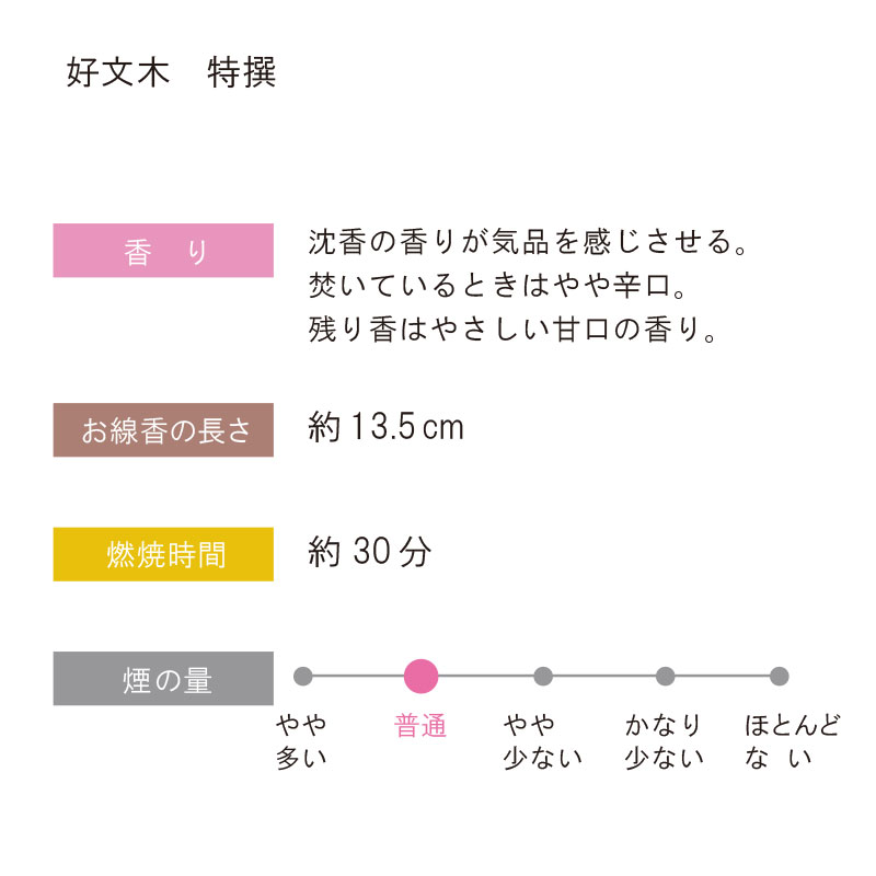 | 商品説明 | 【商品コード:1465】 ■商品詳細 ●内容量:約170g(約490本) ●お線香の長さ:約13.5cm ●煙量:普通 ●燃焼時間:約30分/1本 ●パッケージサイズ:長さ15×幅9.5×高さ4cm ※燃焼時間は、場所・気候(室内状態)により変化致します。 高級沈香、白檀など15種類の天然香料をふんだんに使用。沈香の香りが気品を感じさせる。焚いているときはやや辛口。残り香はやさしい甘口の香り。 |