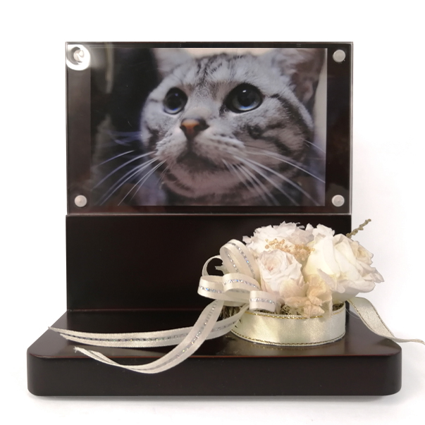 | 商品説明 | 【商品コード:2472】 ■商品詳細 ●商品サイズ:高さ約15.5cm×幅約15cm×奥行約9cm 大切なペットのご供養に、思い出の写真を飾り小さな骨壺や思い出の品などが置ける供養台となっております。 コンパクトなサイズで、小さなスペースにも置け、シンプルな飽きのこないデザインとなっております。 写真を入れるガラス面は、マグネット式となっており取り外しが簡単にできます。 造花は、台座に固定されています。 |