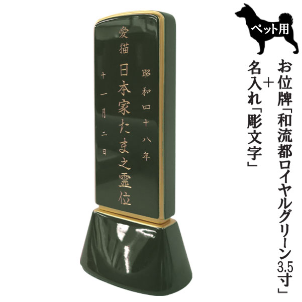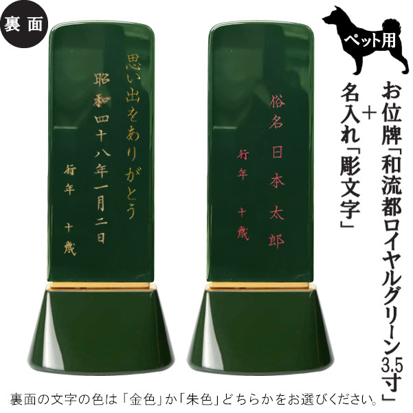 | 商品説明 | 【商品番号:2492】 ペット用のお位牌として、3.5寸サイズのコンパクトなお位牌に彫文字をセットにしました。 お位牌は、デザイナーと職人がこだわり試行錯誤してつくり上げた曲面形状が美しい和流都シリーズを使用。 天然材を使用し熟練の職人による塗り・研磨・金粉撒きまでを国内生産することにこだわったお位牌となっております。 また、底面には、お仏壇に小キズが付かないようにフェルトが貼られた丁寧な作りになっています。 ※ご連絡事項に次の内容をご記入ください。 ●表面の彫文字の内容 ●裏面の彫文字の内容 ●裏面の彫文字の色 金色/朱色 ■商品詳細 ●お位牌の色 「ロイヤルグリーン」 ●文字 「彫文字」 ●文字の色 表面「金色」/ 裏面「金色」か「朱色」 ※西暦表記でも承ります。 ※数字は全て漢数字になります。 ●商品サイズ 位牌サイズ:高さ約14.2cm×奥行約4cm×幅約6cm |