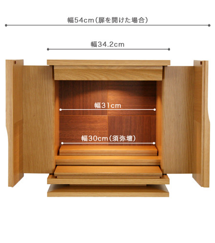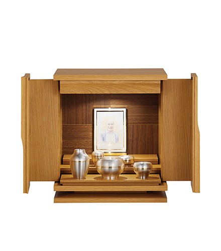 | 商品説明 | 【商品コード:2526】 ■材質詳細 ・材質/ホワイトオーク、ウォールナット ・仕上/ウレタン塗装 ■宗派 どの宗派でもお使いいただけます。 ■備考 ・掲載写真の仏具などの組み合わせは一例で別売りとなります。 小さくておしゃれな仏壇「フォーリーフ」。名前の通り、四つ葉のクローバーを思わせる扉のデザインが気持ちを和ませてくれます。一つひとつ削り出した滑らかな曲面に、ホワイトオークの柾目の突板をくるりと回して貼りあわせました。扉を開けた時の解放感や、使い勝手のよいスライド式須弥壇も見どころです。 |