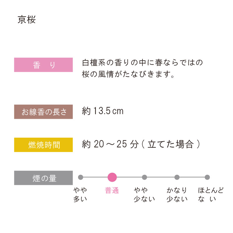 | 商品説明 | 【商品コード:1473】 ■商品詳細 ●お線香の長さ:約13.5cm ●煙量:普通 ●燃焼時間:約20~25分(立てた場合) ●パッケージサイズ:長さ16×幅10×高さ3cm ※燃焼時間は、場所・気候(室内状態)により変化致します。 白檀系の香りの中に春ならではの桜の風情がたなびきます。 「京線香」シリーズ 極上の天然香料をふんだんに使用した京線香。 いつの時代にも、心を込めてご先祖さまへお届けください。 仏事だけではなく、お部屋で楽しむ香りとしてもお使いいただけます。 |