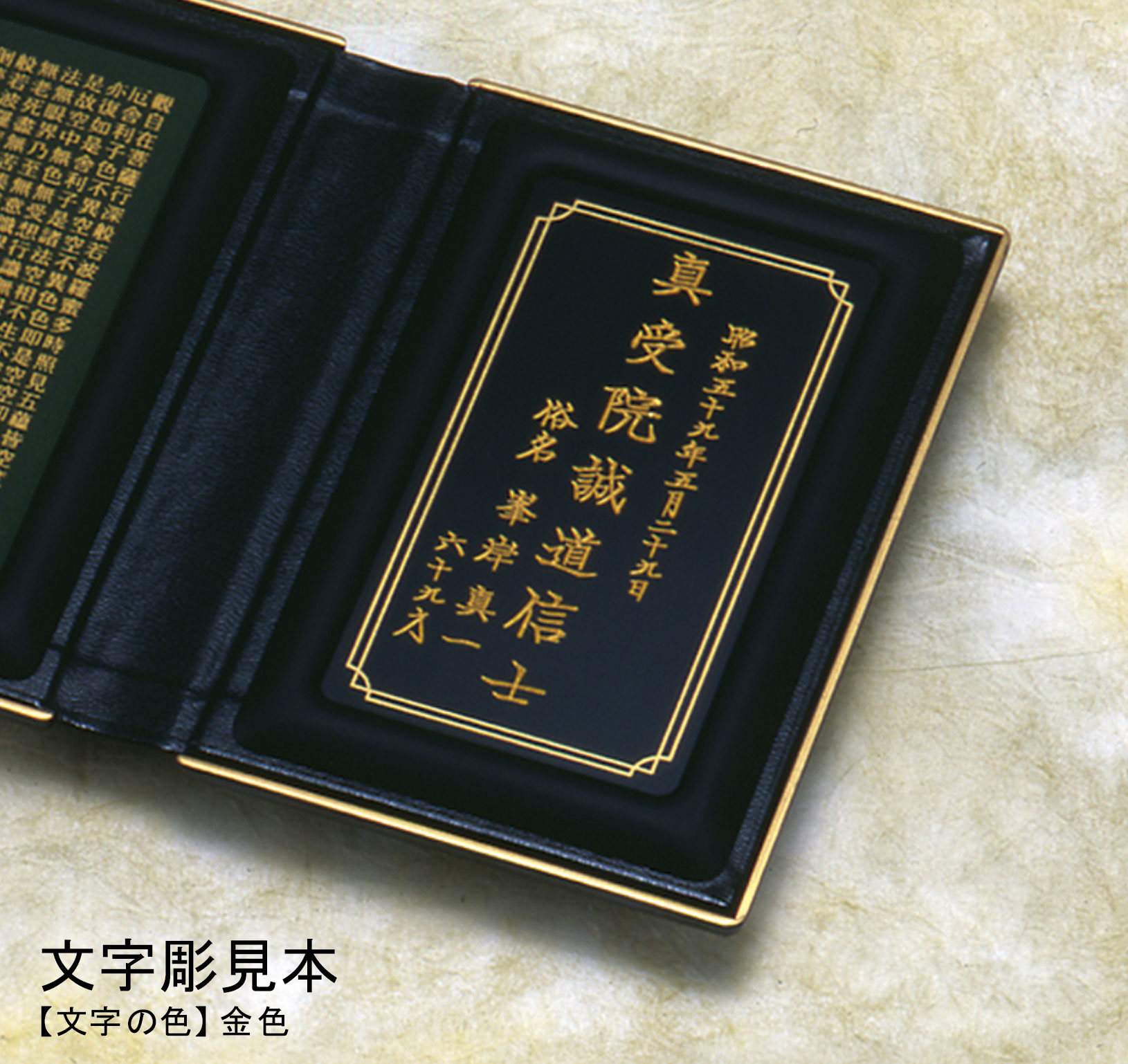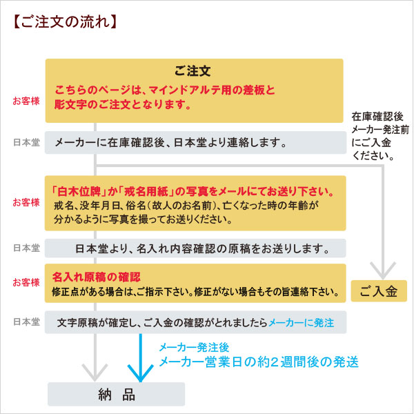 | 商品説明 | 【商品番号:2592】 マインドアルテ専用差板となります。 マインドアルテには戒名を入れるための札板が一枚付属しますが、もう一方の面にも札板を入れる事ができます。ご夫婦、ご兄弟の戒名やご先祖様をおまつりいただく際に2枚目のプレートとしてこちらをご注文ください。 こちらの商品は、1枚のプレートにお一人彫りのみの制作になります。 ※お位牌への文字彫り代金(1名分)を含んだ価格となっております。 ■商品詳細 ●サイズ:本体 : H110 × W62 × D1mm ●文字:彫文字 ●文字の色:「金色」 ※彫文字は、お客様に彫文字の原稿確認をして頂き、文字確認原稿確定後約2週間後の納品となりますので、余裕をもってご注文ください。 ---------------------------- 一度彫った文字は修正ができませんので、必ず下記をよく読んで文字の名入れをお知らせください。 【ご用意いただくもの】 戒名、没年月日、俗名(故人のお名前)、没年齢(故人の年齢)が分かる「白木位牌」「戒名用紙」を写真に撮ってご注文後メールにてお送りください。 メールはタイトルを「彫文字用、戒名・白木位牌写真」として、「注文者のお名前」「お電話番号」「今回ご購入の商品名」をご記入ください。 メールドレス sales@nihondou.co.jp 【オプション選択にて以下の内容をご入力ください】 ●ご希望納期 ●法要日 ●宗派 ●お位牌に入れる文字 戒名・法名 俗名(故人のお名前) 没年齢(故人の年齢) 没年月日 ●文字の色/金色 ●ご希望のレイアウトのパターン 【納期について】 納期は、お客様に彫文字の原稿確認をして頂き、文字確認原稿確定後「メーカー営業日の約2週間後の発送」となります。原稿の確認にもお時間を要します。余裕をもってご注文ください。 【原稿について】 基本的に弊社では「白木位牌」や「戒名用紙」に沿って原稿を作製致します。 故人の年齢の行年・享年の入れ方や戒名の下に「位」を入れるなど、先祖位牌に合わせて白木位牌より変更する場合があります。 また、以下のご説明では一般的な文字入れを記しておりますが、あくまでも一例です。どの文字を入れる・入れないというご指定は「お客様やご住職の判断」となります。事前に菩提寺やご住職にご相談の上、お入れする文字をご確認ください。 (弊社で作成した原稿を、菩提寺やご住職にご確認いただくと確実かと存じます) 【文字入れについて】 機械彫は札板に機械で文字を彫り、そこに金を箔押しします。 しっかりと彫られているため経年劣化が少なく、文字の美しさが長持ちします。 【お位牌にお入れする文字】 ■戒名・法名 先代のお位牌に合わせるなど、戒名の下に「位」や「霊位」などを付ける場合は、ご入力の際に「位」や「霊位」までご入力ください。 ・真言宗は、一般的には大日如来を示す梵字の「ア」字を記入してます。 ・白木位牌に入っている「新帰元」「帰元」「新円寂」などの文字は一般的に本位牌には入れません。 ・一戒名のお値段です。二名彫りより別途料金が発生します。 ■俗名(故人のお名前) ・生前の名前を入れ、一般的には名前の上に「俗名」と記入します。 ■没年齢(故人の年齢) 没年齢を記載の際は、以下の点をご注意ください。 ・先祖位牌に「行年」とあり、白木の位牌に「享年」とある場合等、先祖位牌に合わせて行年・享年を変更する場合があります。お寺様によって没年例の数え方が違うので、ご不明な点は菩提寺やご住職にお尋ねください。 記入例)「行年〇〇才」「行年〇〇歳」「享年〇〇才」「享年〇〇歳」「(行年・享年を付けない)〇〇才」「(行年・享年を付けない)〇〇歳」「(その他の文言)〇〇才」「(その他の文言)〇〇歳」「行年〇〇(才・歳を付けない)」「享年〇〇(才・歳を付けない)」等々 ■没年月日 亡くなった日を記入します。 ・白木の位牌の年月日の下に「没」「寂」などの文字が書かれている場合は一般的には省きます。 【梵字について】 梵字は、真言宗なら「ア」・浄土宗なら「キリーク」・浄土真宗なら「法名」など、宗派により異なり、さらに地域によっては入れない場合があるなど様々です。 ご不明な点は菩提寺やご住職にお尋ねください。 【文字の色について】 ●文字の色:「金色」 |