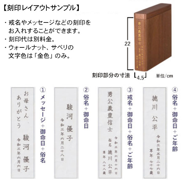 | 商品説明 | 【商品コード:2670】 ご遺骨をパウダー状に粉骨し ご自宅で、故人を偲ぶことのできる新しいご供養のかたちです。 パウダー状のご遺骨全体を特許出願した方法によりコンパクトに納めることができる箱のシリーズです。 骨は地球の恵みによってできた結晶であり、サラサラとなった骨はやがてまたその地球という星のかけらとなって循環していく。 「星粒の箱」はそんな思いから付いた名です。 星粒の箱 レストは、お仏壇の下台や書棚などに安置しやすいブック型。 磁石で着脱可能な前板には、戒名やメッセージなどの刻印をお入れすることができます。 ■商品詳細 ●材質:ウォールナット ●サイズ:高さ24.5cm×幅6cm×奥行26.5cm ●刻印代は文字数に関わらず一律 4、180円(税込) ※粉骨、洗骨には別途料金が必要です。 |