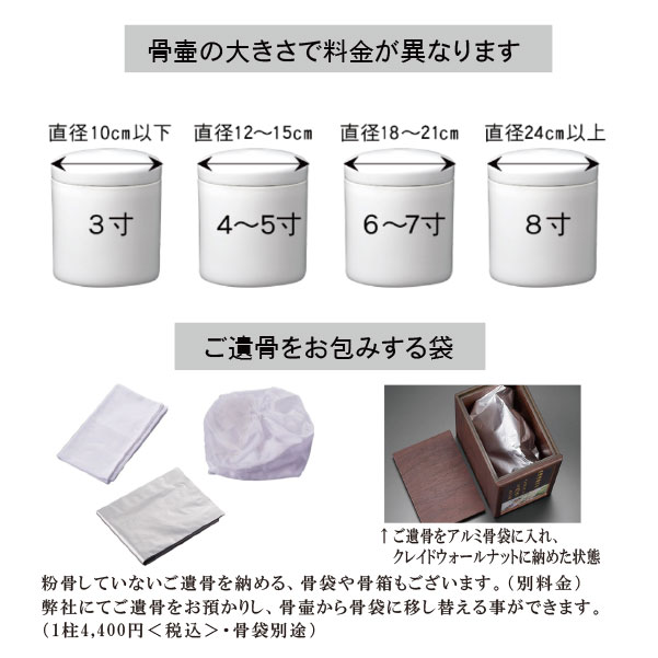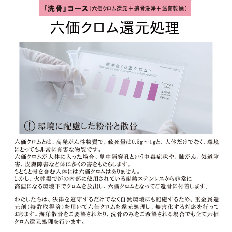 | 商品説明 | 【商品コード:2690】 骨壷直径10cm(3寸)以下の洗骨 (六価クロム還元・遺骨洗浄・滅菌乾燥)料金となります。(粉骨代は別) 改葬(お墓のお引越し)やお墓じまいをし、納骨堂などにご遺骨を再安置する際、遺骨の乾燥や洗浄が求められることがあります。 また、お墓から出されたご遺骨は水分を含んでいるため、粉骨をご希望の場合も洗骨を合わせて施工致します。 ■詳細 ・骨壷直径10cm(3寸)以下の洗骨 ※粉骨代は別(粉骨もご希望の場合は、別途粉骨もご注文ください) ・期間:お預かり後約2週間(洗骨のみの場合) ・期間:お預かり後約4週間(洗骨+粉骨の場合) ■送骨梱包セット ご遺骨をお客様宅から弊社まで送付頂くための「送骨梱包セット 2、200円 (税込)」をご希望の方には発送(運賃は弊社負担)致します。 「オプション選択」よりお選び下さい。 ・送骨梱包セットの内容:ダンボール箱・緩衝材・ゆうパック送り状・取扱注意ステッカー・梱包方法の説明書・提出書類チェックシート |