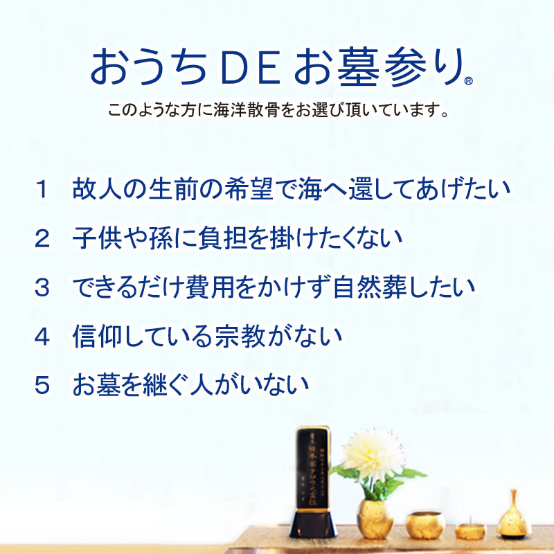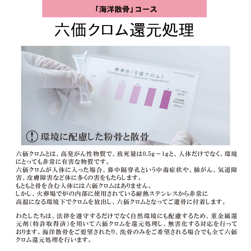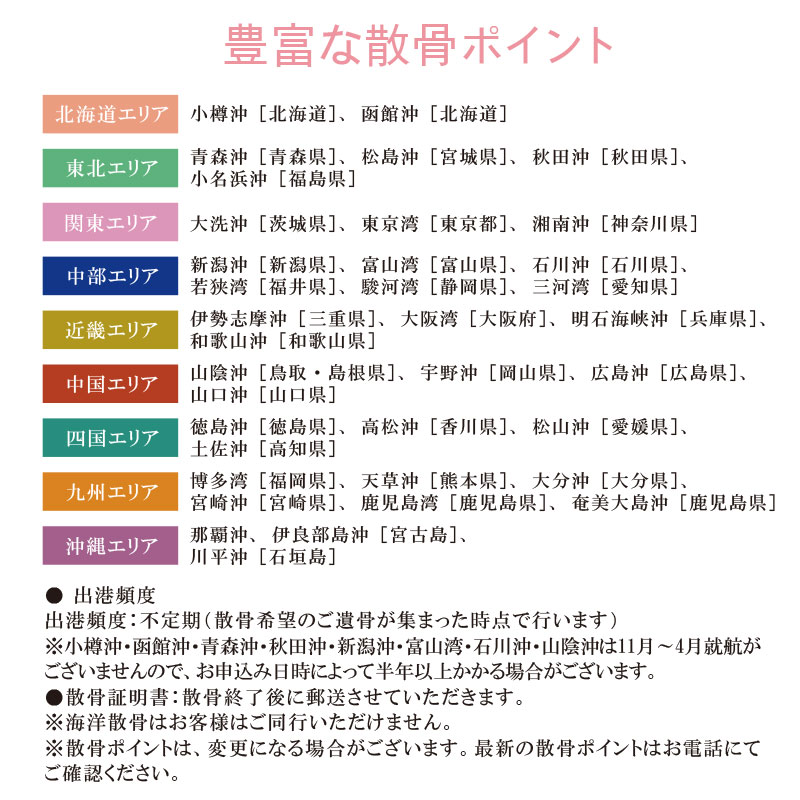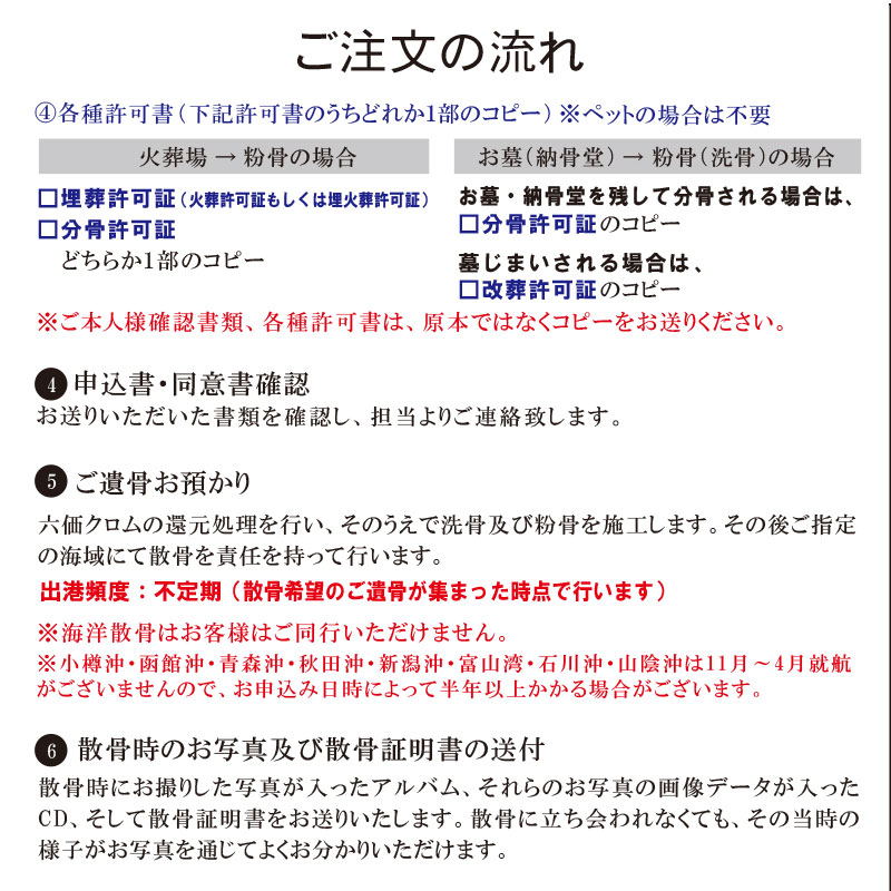 | 商品説明 | 【商品コード:2694】 骨壷直径10cm(3寸)以下の海洋散骨料金となります。 海洋散骨をお考えのお客様におすすめするプランです。まずご遺骨に対して海への環境に配慮した六価クロムの還元処理を行い、そのうえで洗骨及び粉骨を施工します。その後ご指定の海域にて散骨を責任を持って行い、別途お客様に散骨証明書をご郵送致します。 ●散骨場所: ・北海道エリア:小樽沖、函館沖 ・東北エリア:青森沖、松島沖、秋田沖、小名浜沖 ・関東エリア:大洗沖、東京湾、湘南沖 ・中部エリア:新潟沖、富山湾、石川沖、若狭湾、駿河湾、三河湾 ・近畿エリア:伊勢志摩沖、大阪湾、明石海峡沖、和歌山沖 ・中国エリア:山陰沖、宇野沖、広島沖、山口沖 ・四国エリア:徳島沖、高松沖、松山沖、土佐沖 ・九州エリア:博多湾、天草沖、大分沖、宮崎沖、鹿児島湾、奄美大島沖 ・沖縄エリア:那覇沖、伊良部島沖、川平沖 【出港頻度】不定期(散骨希望のご遺骨が集まった時点で行います) ※小樽沖・函館沖・青森沖・秋田沖・新潟沖・富山湾・石川沖・山陰沖は11月~4月就航がございませんので、お申込み日時によって半年以上かかる場合がございます。 ●散骨証明書:散骨終了後に郵送させていただきます。 ※海洋散骨はお客様はご同行いただけません。 ■詳細 ・骨壷直径10cm(3寸)以下の海洋散骨 ■送骨梱包セット ご遺骨をお客様宅から弊社まで送付頂くための「送骨梱包セット 2、200円 (税込)」をご希望の方には発送(運賃は弊社負担)致します。 「オプション選択」よりお選び下さい。 ・送骨梱包セットの内容:ダンボール箱・緩衝材・ゆうパック送り状・取扱注意ステッカー・梱包方法の説明書・提出書類チェックシート ■骨壷・骨箱のご返却 粉骨後の「骨壷・骨箱のご返却」の有無を「オプション選択」よりお選び下さい。 「骨壷・骨箱のご返却」をされる場合、5、500円となります。返却不要の場合は無料。 |