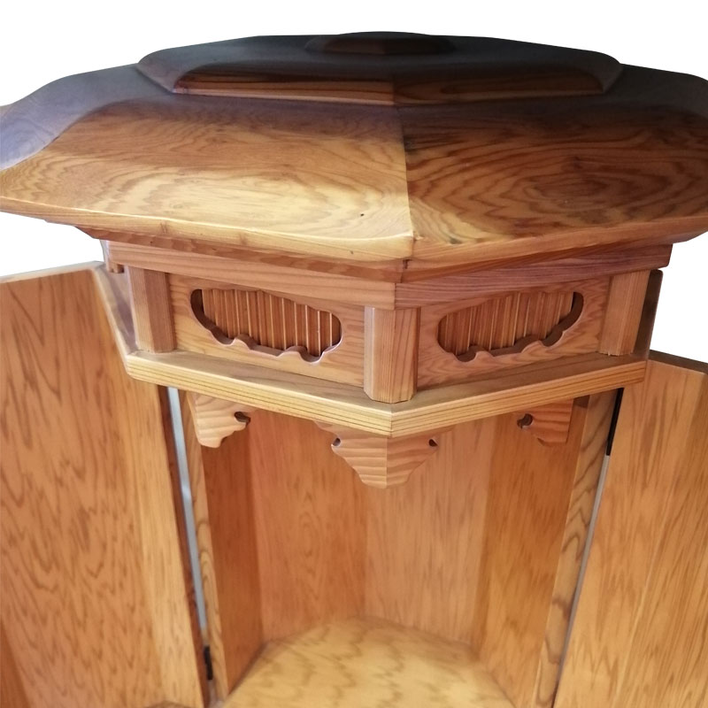 | 商品説明 | 【商品コード:2701】 ■材質詳細 笠、台輪/主材料:屋久杉薄板貼り 芯材料: 戸板、扉/主材料:屋久杉薄板貼り 芯材料: その他/表面仕上げ:摺漆仕上げ、生産地:日本 ■宗派 どの宗派でもお使いいただけます。 ■備考 ・商品は手作りの為、一部の色、デザイン、寸法が多少変更になる場合がございます。 稀材屋久杉材を使用した本格八角厨子型仏壇。地袋仏間、背低サイドボードに設置することを考え収納たっぷりの別台付東京仏壇です。 【東京仏壇:東京都伝統工芸品東京仏壇とは】 東京仏壇の歴史は、1603年に徳川家康が江戸に開府したことにはじまります。宗教政策の一環として仏寺の建立発展を進めた結果、八代将軍吉宗の時代には一般庶民が競って仏壇を祀るようになりました。その需要に応えるべく、江戸指物師や仏師が独自の技法をつぎこみ仏壇をこしらえたのが、東京仏壇の原型です。 その後、1840年ころからは東京仏壇に唐木が使われるようになり、木地本来の持ち味を生かしながら古典的な優美さも残した、丈夫で長持ちする実用本位の仏壇がつくられます。この伝統と技術を受け継いだ職人(伝統工芸士)が丹念に手づくりしたものが、現在わたしたちが目にする東京仏壇なのです。 現在、東京都伝統工芸品東京仏壇には伝統工芸品である証の伝産マークとシリアルナンバーが記された証紙(シール)が貼付されております。お求めの際はこの証紙をお確かめの上、類似品にはご注意ください。 |