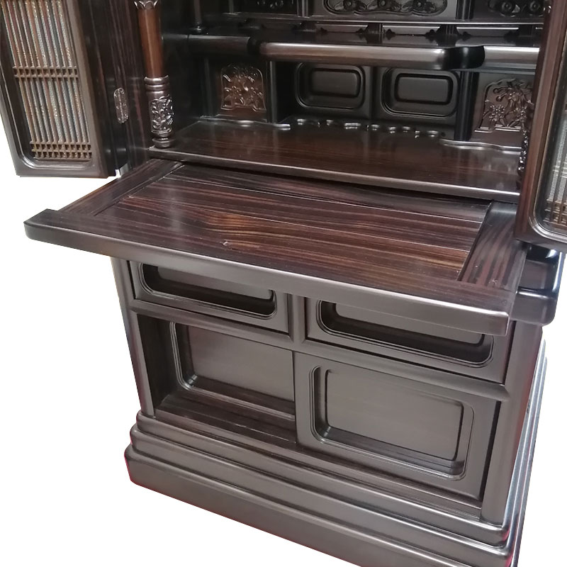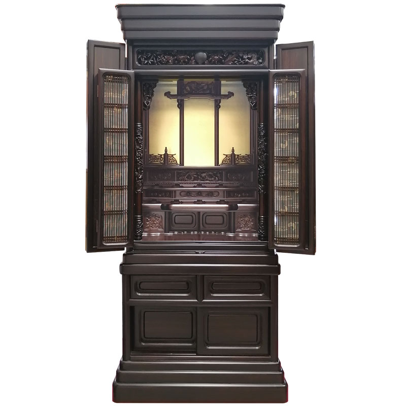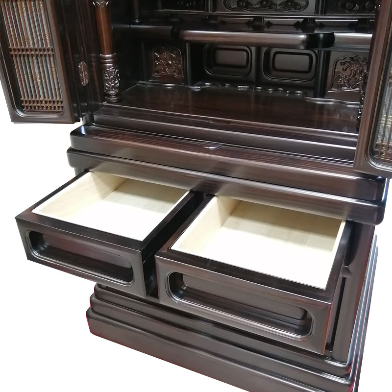 | 商品説明 | 【商品コード:2706】 ■材質詳細 ・笠、台輪/主材料:黒檀厚板貼り 芯材料:朴 ・戸板、扉/主材料:黒檀無垢 芯材料:黒檀無垢 ・大戸軸/主材料:黒檀厚板貼り 芯材料:朴 ・その他/表面仕上げ:摺漆仕上げ、生産地:日本 ■宗派 どの宗派でもお使いいただけます。 ■備考 ・商品は手作りの為、一部の色、デザイン、寸法が多少変更になる場合がございます。 最高級黒檀材を使用した東京仏壇のベストセラー。黒檀厚板無垢を証明する戸板裏レリーフが自慢の逸品です。半間仏間に最適です。 【東京仏壇:東京都伝統工芸品東京仏壇とは】 東京仏壇の歴史は、1603年に徳川家康が江戸に開府したことにはじまります。宗教政策の一環として仏寺の建立発展を進めた結果、八代将軍吉宗の時代には一般庶民が競って仏壇を祀るようになりました。その需要に応えるべく、江戸指物師や仏師が独自の技法をつぎこみ仏壇をこしらえたのが、東京仏壇の原型です。 その後、1840年ころからは東京仏壇に唐木が使われるようになり、木地本来の持ち味を生かしながら古典的な優美さも残した、丈夫で長持ちする実用本位の仏壇がつくられます。この伝統と技術を受け継いだ職人(伝統工芸士)が丹念に手づくりしたものが、現在わたしたちが目にする東京仏壇なのです。 現在、東京都伝統工芸品東京仏壇には伝統工芸品である証の伝産マークとシリアルナンバーが記された証紙(シール)が貼付されております。お求めの際はこの証紙をお確かめの上、類似品にはご注意ください。 |