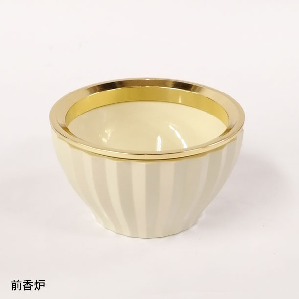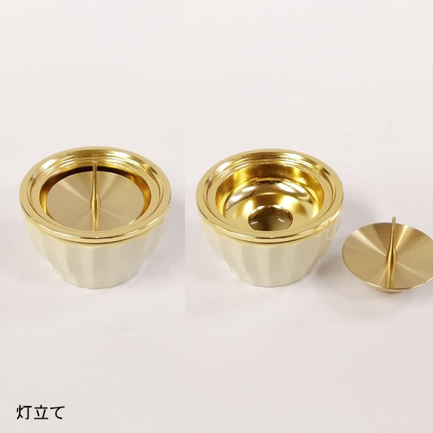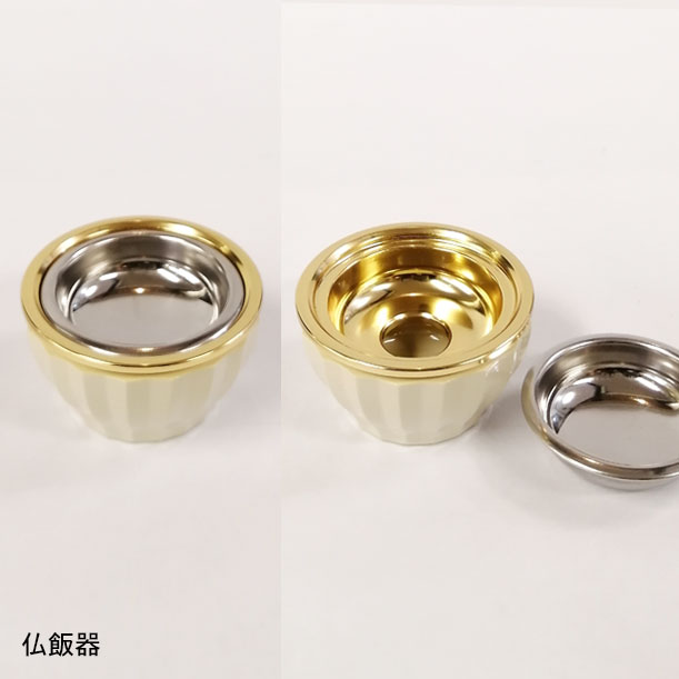 | 商品説明 | 【商品コード:2743】 ■材質詳細 ・セット内容:花立・線香立て・前香炉・灯立・茶湯器(お水・お茶用)・仏飯器(ご飯用) ・サイズ:3寸 花立/φ5.7cm、高さ9cm 線香立て/φ3.6cm、高さ7.2cm 前香炉/φ9cm、高さ5.1cm 灯立/φ5.2cm、高さ4cm 茶湯器/φ5cm、高さ4.1cm 仏飯器/φ5.2cm、高さ3.1cm ・主素材/真鍮 ■宗派 どの宗派でもお使いいただけます。 ■備考 ※類似品にご注意ください。 美しいフォルムに立体的なラインがシャープな印象を演出。 しっかりとした重量と安定感、高級感のある光沢が特徴の仏具となっております。 お仏壇に馴染みやすく、コーディネートしやすい6点セットの仏具となります。 茶湯器と仏飯器には錆びにくく耐久性のあるステンレス製の「落とし」がついています。 取り外してご飯やお水等の交換が出来るので、仏具を汚すことなくお手入れが簡単です。 |