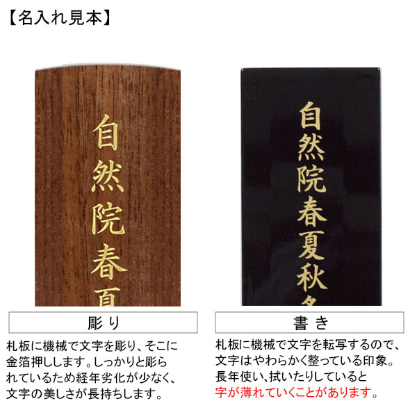 お位牌とは別に名入れの「彫り代」または「書き代」が必要です。以下よりご注文ください。