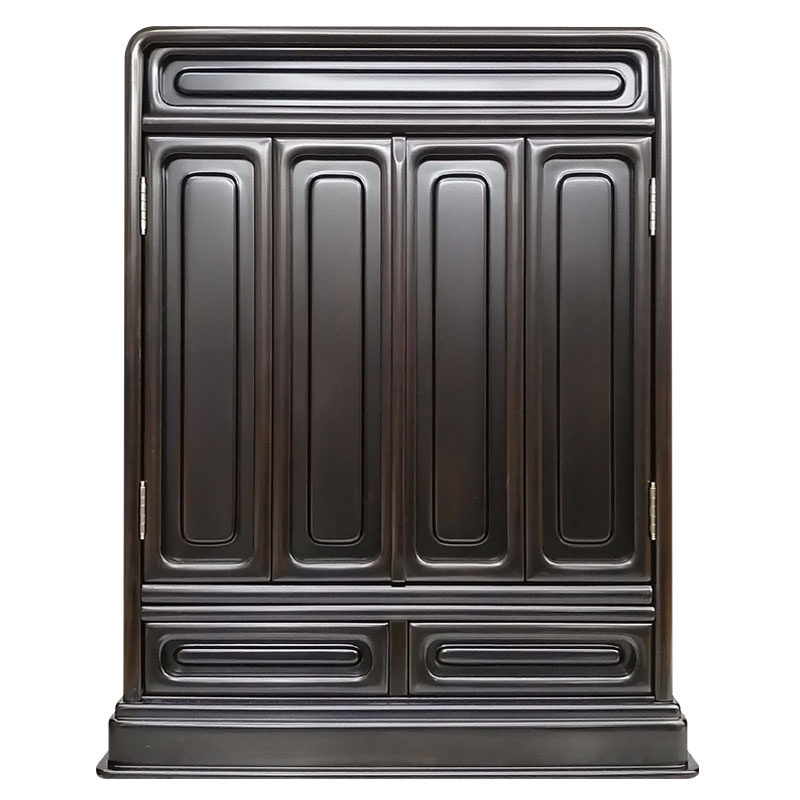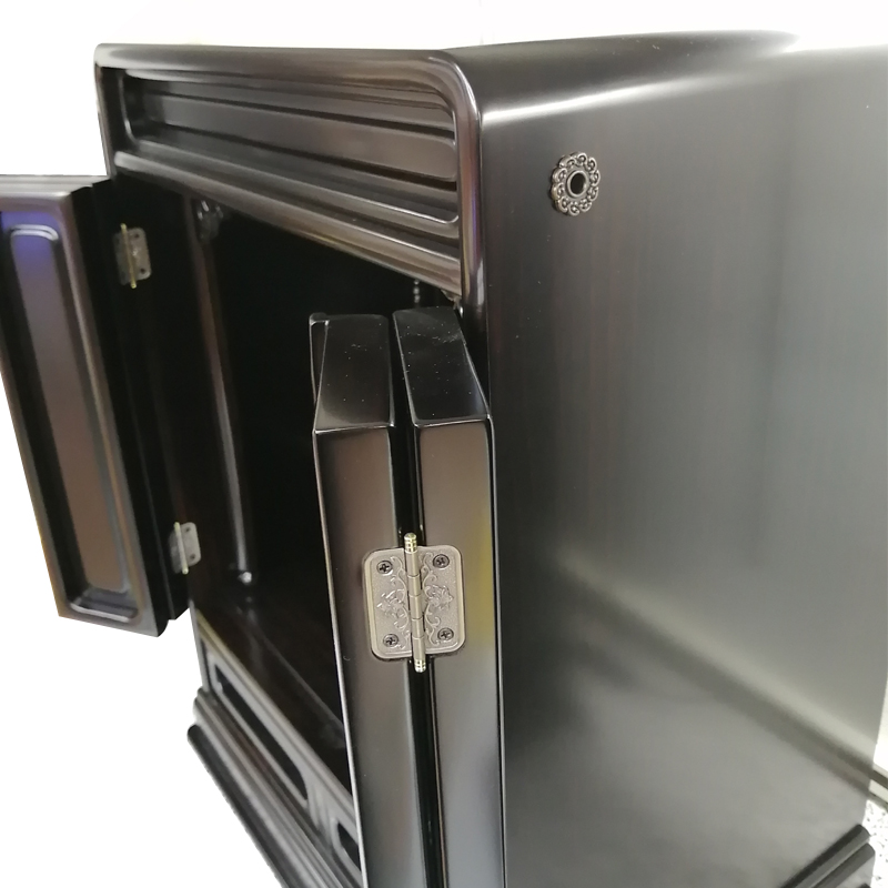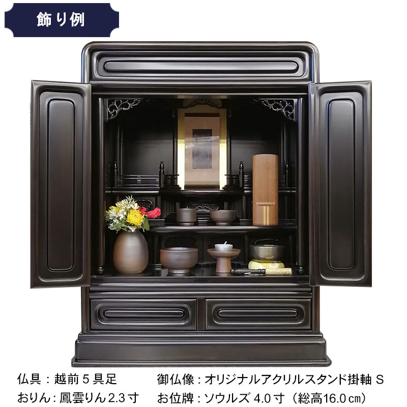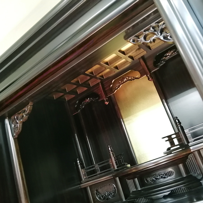 | 商品説明 | 【商品コード:2836】 ◎日本堂オリジナル ■材質詳細 ・笠、台輪/主材料:紫檀系(ブビンガ)薄板貼り 芯材料:MDF ・戸板、扉/主材料:紫檀系(ブビンガ)薄板貼り 芯材料:MDF ・大戸軸/主材料:紫檀系(ブビンガ)薄板貼り 芯材料:MDF ・その他/表面仕上げ:ラッカー仕上、生産地:海外 ■宗派 どの宗派でもお使いいただけます。 ■備考 ・商品は手作りの為、一部の色、デザイン、寸法が多少変更になる場合がございます。 コンパクトな唐木仏壇で、扉の蝶番が本体の内側についているため、他のお仏壇より開いた時の巾をとらない造りとなっております。 照明が無くても掛軸や仏像が映えるよう、背板中央に金紙を施しました。 また、須弥壇が半円状(丸出須弥壇)にせり出しているのでご本尊もすっきりと安置出来ます。 収納は、左右に分かれていて桐の落しが入っている引き出しに加えて、内陣にはご本尊に一番近い収納スペース(猫戸)があり、御遺品などを収納できます。 紫檀薄板貼りで、とてもお得な商品となっております。 |
