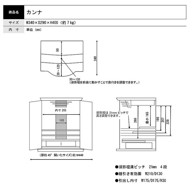 | 商品説明 | 【商品コード:2875】 ■材質詳細 ・材質/サクラ・ウォールナット ・仕上/ウレタン塗装 ■宗派 どの宗派でもお使いいただけます。 ■備考 ・掲載写真の仏具などの組み合わせは一例で別売りとなります。 上下前後に位置を変えられる機能的な須弥壇。柔らかさと温かさを感じさせるデザインです。 |