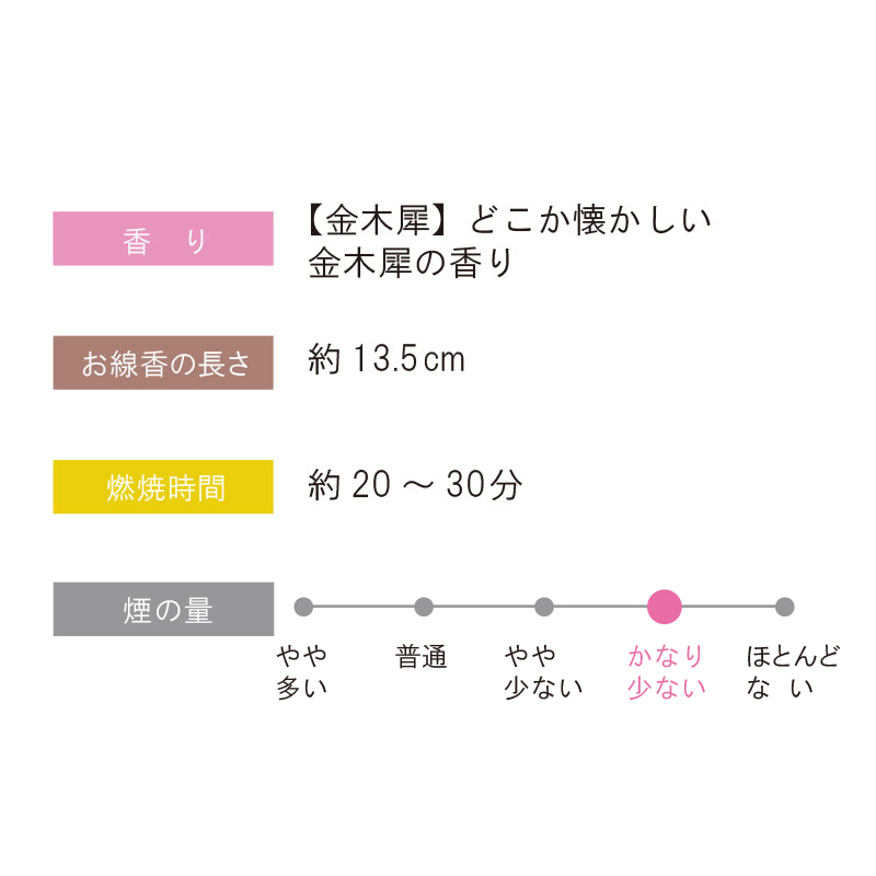 | 商品説明 | 【商品コード:2907】 ■商品詳細 ●【金木犀】どこか懐かしい金木犀の香り ●内容量:お香(ロングタイプ)40本 アルミ香立1個 ●お線香の長さ:約13.5cm ●燃焼時間:約20-30分(1本あたり)(煙の少ないタイプ) ●パッケージサイズ:長さ15.7×幅3.5×高さ2.0cm ※燃焼時間は、場所・気候(室内状態)により変化致します。 ※付属の香立てをご使用の際は、灰を受ける不燃性のお皿などの上に置いてからお使いください。 御仏前用のお線香なども製造している香匠たちが手掛けたスティック型の室内香です。 厳選された天然白檀と原料を調合した大変上質なお香となっております。 リモートワークやオンライン授業などで、 自宅で過ごす時間をより豊かにしたいという方のご利用が増えています。 |