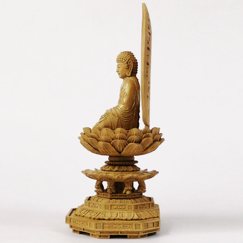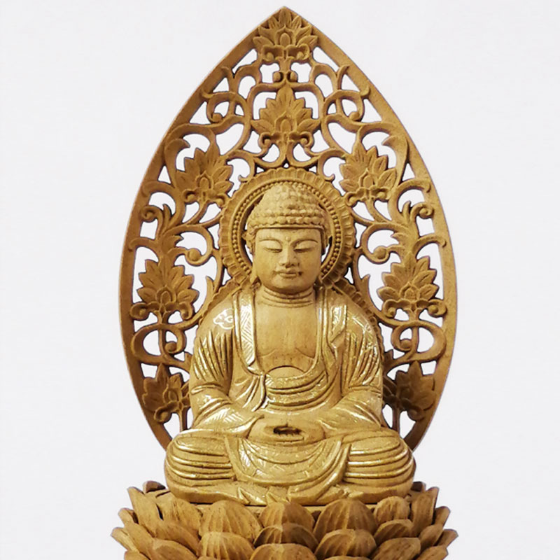 | 商品説明 | 【商品コード:2922】 ■商品詳細 ●寸法3.0寸:総高さ 約30.2cm、幅 約15.5cm、奥行 約13.2cm ●材質:楠 ●宗派:禅宗(臨済宗・曹洞宗) ■備考 ※手作り品のため寸法は、おおよその数値です。 ※自然木を使用した手彫り仕上げのため、一体一体仕上がりや木目・色味が異なる場合があります。 また、年を重ねると色目が変わって(濃く)きます。 ・お取り寄せ商品となっております。在庫状況や納期はお問合せ下さい。 禅宗(臨済宗・曹洞宗)のご本尊として祀られる、楠製の御仏像です。 楠は、樹齢が千年を超える木もあり、信仰の対象として多くの神社仏閣の境内に植栽されています。材質は軟らかくて加工しやすく、磨くと光沢がでるという特徴があります。 また、樟脳(しょうのう)の原材料であり防虫効果があります。 金泥書きを施しているため非常に高級感が溢れた仕上がりとなっています。 光背に使われている唐草は、四方八方に伸びる様子から、仏教ではとても縁起が良いといわれています。 |