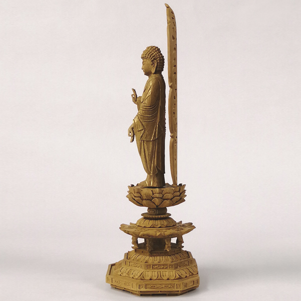 | 商品説明 | 【商品コード:2924】 ■商品詳細 ●寸法 3.5寸:総高さ 約24.5cm、幅 約8.7cm、奥行 約7.5cm ●材質:楠 ●宗派:浄土宗 ■備考 ※手作り品のため寸法は、おおよその数値です。 ※自然木を使用した手彫り仕上げのため、一体一体仕上がりや木目・色味が異なる場合があります。 また、年を重ねると色目が変わって(濃く)きます。 ・お取り寄せ商品となっております。在庫状況や納期はお問合せ下さい。 浄土宗のご本尊として祀られる、楠製の御仏像です。 楠は、樹齢が千年を超える木もあり、信仰の対象として多くの神社仏閣の境内に植栽されています。材質は軟らかくて加工しやすく、磨くと光沢がでるという特徴があります。 また、樟脳(しょうのう)の原材料であり防虫効果があります。 金泥書きを施しているため非常に高級感が溢れた仕上がりとなっています。 光背に使われている唐草は、四方八方に伸びる様子から、仏教ではとても縁起が良いといわれています。 |