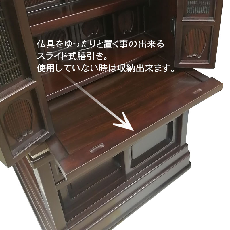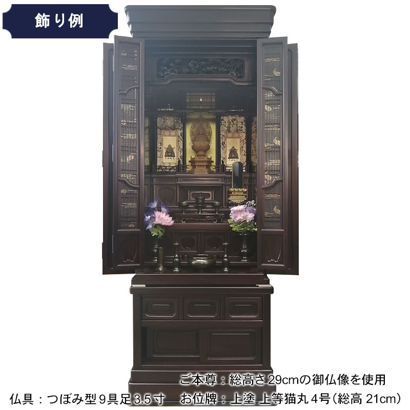 | 商品説明 | 【商品コード:2931】 ◎日本堂オリジナル ■材質詳細 ・笠、台輪/主材料:紫檀板貼り 芯材料:天然木材 ・戸板、扉/主材料:紫檀無垢 芯材料:紫檀無垢 ・大戸軸/主材料:紫檀板貼り 芯材料:天然木材 ・その他/表面仕上げ:ウレタンオープン仕上、生産地:日本 ■宗派 どの宗派でもお使いいただけます。 ■備考 ・商品は手作りの為、一部の色、デザイン、寸法が多少変更になる場合がございます。 高級仏壇産地として有名な徳島県産の唐木仏壇となっております。 内陣は、吊宮殿で柱が無いので仏像もスッキリとお祀りいただけます。 背板は、照明が無くても掛軸や仏像が映えるよう、中央に金紙を施しました。 欄間は、無垢材で東洋画で古代より草木の中の君子と称えられる4種の草木(蘭・竹・菊・梅)が施された四君子彫仕上げになっております。 内障子はスッキリとした組子仕上げとなっています。 引出は高級仏壇の証、桐の落とし付で調湿効果・耐火性に優れ、遺品や念珠・お線香等の保管に最適な仕上げになっております。 |
