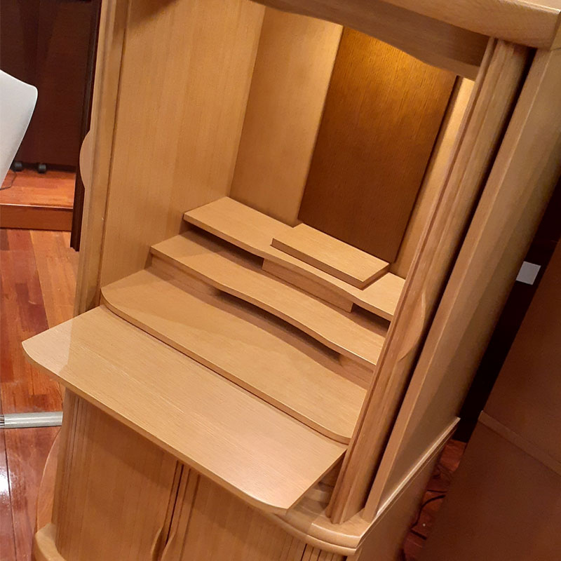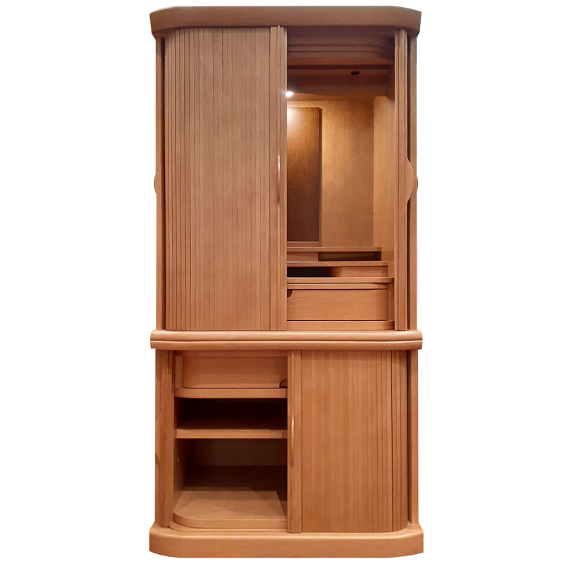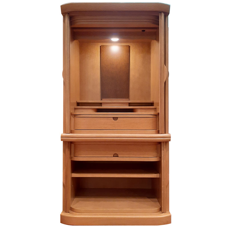 | 商品説明 | 【商品コード:2942】 ◎日本堂オリジナル商品 ■材質詳細 ・笠、台輪/主材料:ナラ厚板貼り 芯材料:木質繊維板 ・戸板、扉/主材料:ナラ薄板貼り 芯材料:木質繊維板 ・その他/表面仕上げ:ウレタン塗装、生産地:日本 ■宗派 どの宗派でもお使いいただけます。 ■備考 ・商品は手作りの為、一部の色、デザイン、寸法が多少変更になる場合がございます。 ナラ材を使用した、ゆるやかな曲線が美しい巻き戸式スライド扉のお仏壇です。 ナラ材の伸びやかで力強い木目は、高級感と重厚感があり洋室にも和室にも溶け込むデザインとなっております。 横幅は60cmと幅広の為お位牌や仏具をゆったりと置くことができます。ワイドタイプながら、扉を内部にスライドさせて収納出来るので左右に扉を開くスペースが不要で場所を取らない省スペース設計となっております。また、本尊台と須弥壇は脱着が可能で、大きな御本尊様や御位牌様も入ります。 引出は上台と下台両方に付いているので、お仏壇周りの小物をゆったりと収納可能。 下台の棚板は取外し可能で、棚板の高さも2段階で調整ができます。 |