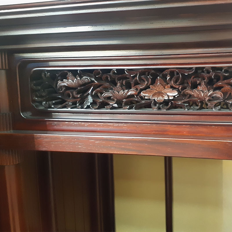 | 商品説明 | 【商品コード:2944】 ◎日本堂オリジナル ■材質詳細 ・笠、台輪/主材料:紫檀(ホンジュラローズ)厚板貼り 芯材料:ニヤトー ・戸板、扉/主材料:紫檀(ホンジュラローズ)無垢 芯材料:紫檀(ホンジュラローズ)無垢 ・大戸軸/主材料:紫檀(ホンジュラローズ)三方厚板貼り 芯材料:ニヤトー ・その他/表面仕上げ:ウレタンオープン仕上、生産地:日本 ■宗派 どの宗派でもお使いいただけます。 ■備考 ・商品は手作りの為、一部の色、デザイン、寸法が多少変更になる場合がございます。 日本堂が誇るオリジナル最高級仏壇シリーズ「極」。 威風堂々としたそのデザイン。また希少な紫檀(ホンジュラローズ)の厚板をふんだんに使用しております。 下台は収納式経机となっており、膳引きは上台はもとより、下台収納式経机にもあるので、お彼岸・お盆時期などお供物が多くなる季節は上台膳引き・収納式経机・経机膳引きと三段の違い棚としても使用でます。 膳引きや上台側面は短冊(フローリング)仕上げで手の込んだ造りとなっています。 天井部分は寺院建築と同じ折上げ格天井となっており、吊り空殿仕上なので御仏像がゆったりとお祀りいただけます。 内陣は無垢製高欄をはじめ、障子桟まで無垢製と希少材本黒檀を贅沢に使用し、隠し引出しも備えております。 下台の台輪部分は一杯引きの引出(桐落し付)をなっており、会葬者名簿やお着物など面積のある品々を収納することも可能です。 欄間は、無垢材で東洋画で古代より草木の中の君子と称えられる4種の草木(蘭・竹・菊・梅)が施された四君子彫仕上げになっております。 引出は高級仏壇の証、桐の落とし付で調湿効果・耐火性に優れ、遺品や念珠・お線香等の保管に最適な仕上げになっております。 |