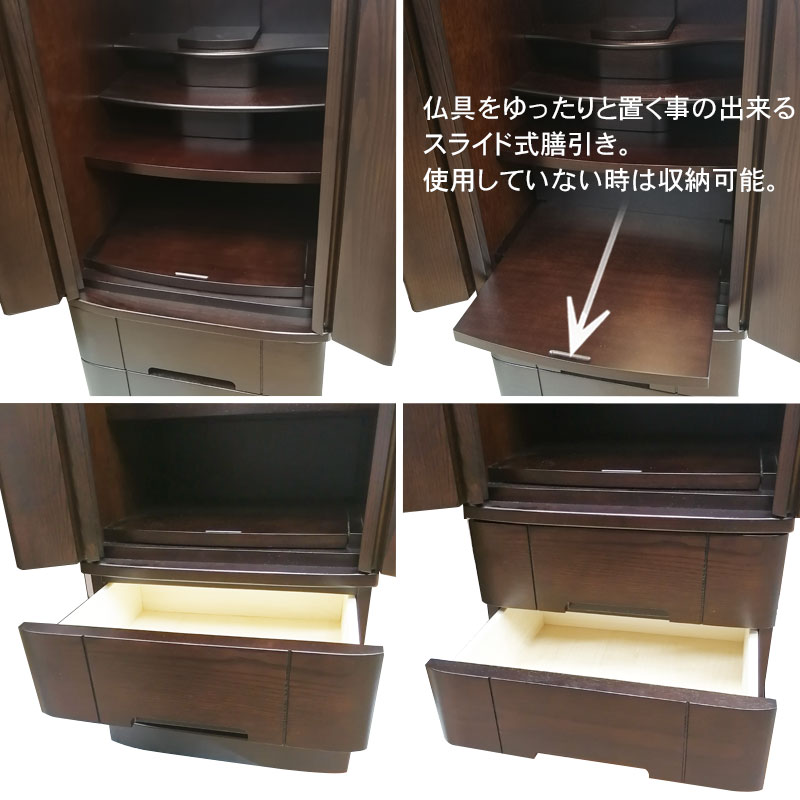| 商品説明 | 【商品番号:2950】 ◎日本堂オリジナル商品 ■材質詳細 ・笠、台輪/主材料:タモ厚板貼り 芯材料:パーチクルボード+木質繊維板 ・戸板、扉/主材料:タモ 芯材料:タモ ・その他/表面仕上げ:ウレタン仕上げ、生産地:日本 ■宗派 どの宗派でもお使いいただけます。 ■備考 ・商品は手作りの為、一部の色、デザイン、寸法が多少変更になる場合がございます。 まっすぐ伸びた美しい木目が特徴のタモ材を使用した、国産のお仏壇です。 41号サイズで下台が低いため、正座をした際にちょうど良い高さでお参りしやすいつくりとなっております。 上台は胴長で須弥壇から天井まで48cm(須弥壇を外すと55cm)あり、大きな掛軸・仏像に対応できます。 下台は深めの引き出しタイプで、収納力も抜群で高機能なお仏壇となっております。 |