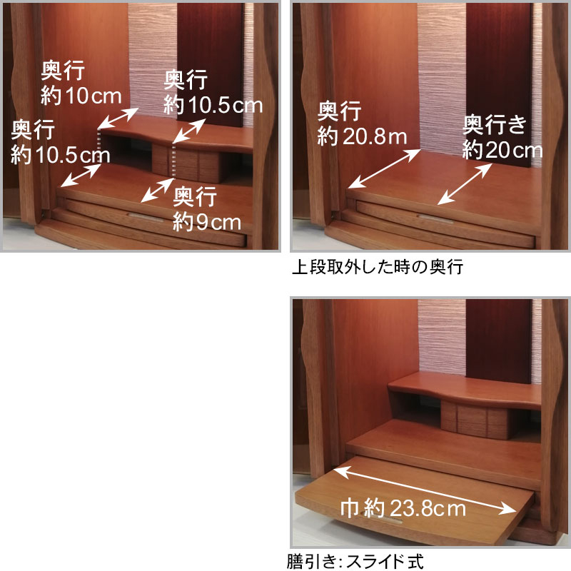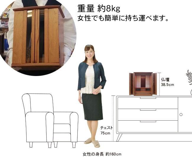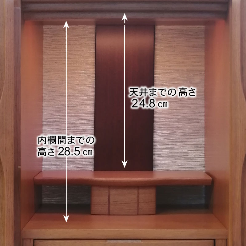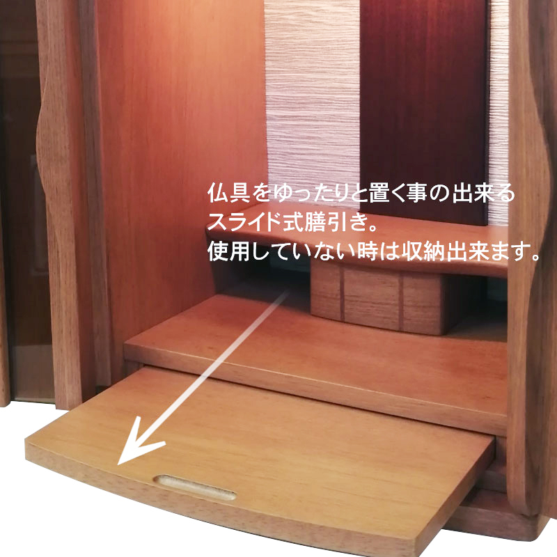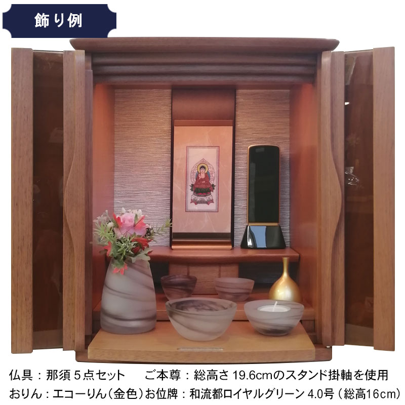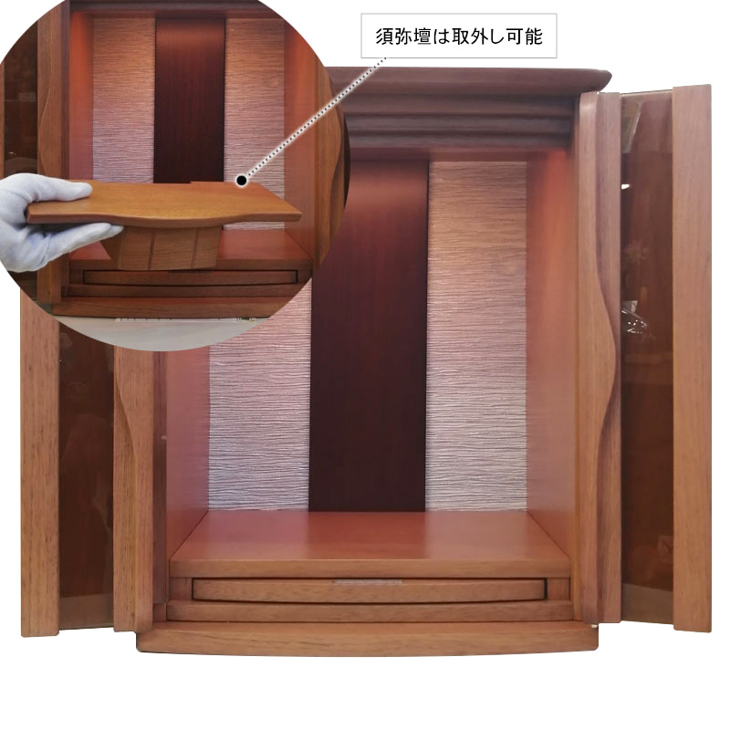 | 商品説明 | 【商品番号:3053】 ◎日本堂オリジナル商品 ■材質詳細 ・笠、台輪/主材料:クルミ無垢 芯材料:クルミ ・戸板、扉/主材料:クルミ無垢 芯材料:クルミ ・その他/表面仕上げ:ウレタン仕上げ、生産地:日本 ■宗派 どの宗派でもお使いいただけます。 ■備考 ・商品は手作りの為、一部の色、デザイン、寸法が多少変更になる場合がございます。 コンパクトさが特徴の12号サイズのお仏壇となっております。 こちらのミニ仏壇は、胡桃の天然木を使用しており年月が経つごとに深みのある味わいをお楽しみいただけるお仏壇となっております。 扉にはアンバー色のガラスが設置されており、ガラス扉を閉めるとうっすらと中が見え、明るい雰囲気でご安置いただけます。 照明はLEDのテープライトを使用し、内欄間の裏側天井部分に設置されており正面からは見えない設計になっております。スイッチは、お仏壇裏側のコードに中間スイッチが設けられています。 内部の須弥壇は取り外しが可能で、ご本尊や掛軸の大きさに合わせて高さを変えることができます。また、お仏壇のお手入れがしやすく、奥の方の細かな部分まで、しっかりお手入れして頂くことが出来ます。 |