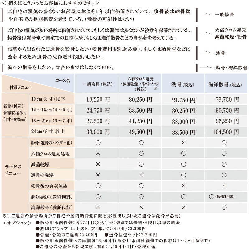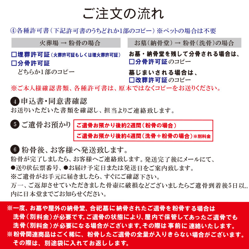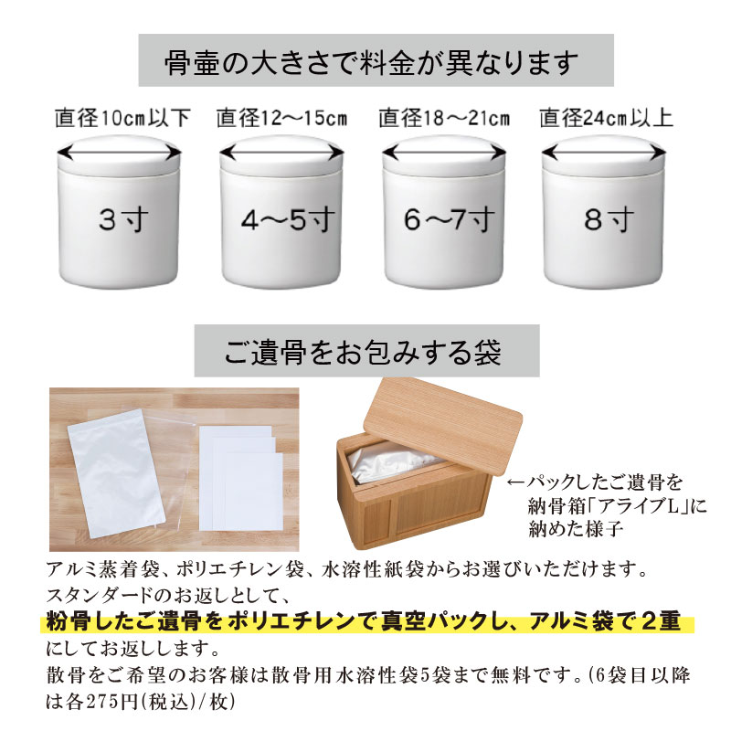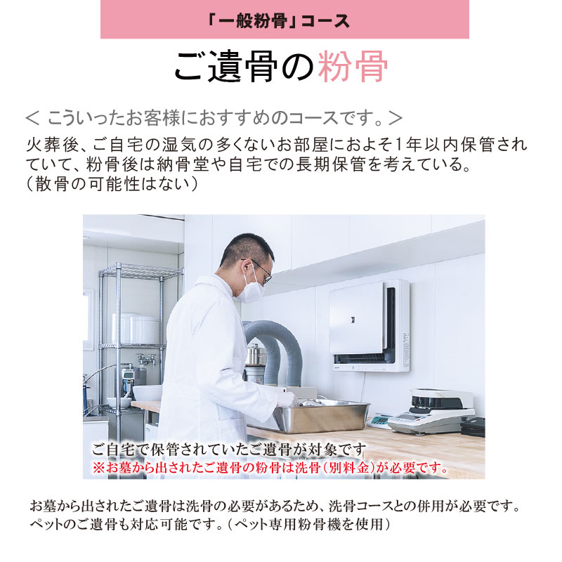 | 商品説明 | 【商品コード:3054】 骨壷直径10cm(3寸)以下の「一般粉骨」料金となります。 火葬後ご自宅の湿気の多くないお部屋に目安としておよそ1年以内保管されていて、粉骨後は納骨堂や自宅での長期保管を考えている方(散骨のご予定はない)におすすめするコースです。お墓から出されたご遺骨は洗骨の必要があるため、洗骨コースとの併用が必要です。 ペットのご遺骨も対応可能です。 (ペット専用粉骨機を使用) ■詳細 ・骨壷直径10cm(3寸)以下の「一般粉骨」 ・期間:お預かり後約2週間 ■送骨梱包セット ご遺骨をお客様宅から弊社まで送付頂くための「送骨梱包セット 2、200円 (税込)」をご希望の方には発送(運賃は弊社負担)致します。 「オプション選択」よりお選び下さい。 ・送骨梱包セットの内容:ダンボール箱・緩衝材・ゆうパック送り状・取扱注意ステッカー・梱包方法の説明書・提出書類チェックシート ■骨壷・骨箱のご返却 粉骨後の「骨壷・骨箱のご返却」の有無を「オプション選択」よりお選び下さい。 「骨壷・骨箱のご返却」をされる場合、5、500円となります。返却不要の場合は無料。 |