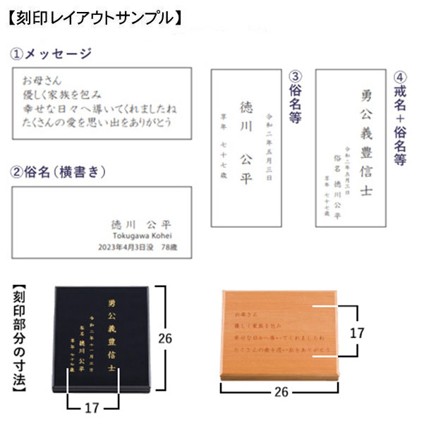 | 商品説明 | 【商品コード:3067】 ご遺骨をパウダー状に粉骨し ご自宅で、故人を偲ぶことのできる新しいご供養のかたちです。 パウダー状のご遺骨全体を特許出願した方法によりコンパクトに納めることができる箱のシリーズです。 骨は地球の恵みによってできた結晶であり、サラサラとなった骨はやがてまたその地球という星のかけらとなって循環していく。 「星粒の箱」はそんな思いから付いた名です。 お仏壇の引き出しにご遺骨を入れて保管したいというお客様の声により誕生しました(お持ちのお仏壇の引き出しに入るか事前に寸法をご確認ください)。フラットですっきりとしたデザインですので、チェストや棚の上に置かれてもよいでしょう。 ■商品詳細 ●サイズ:高さ4.5×幅28×奥行23.5cm ●刻印代は文字数に関わらず一律 4、180円(税込) ※粉骨、洗骨には別途料金が必要です。 |