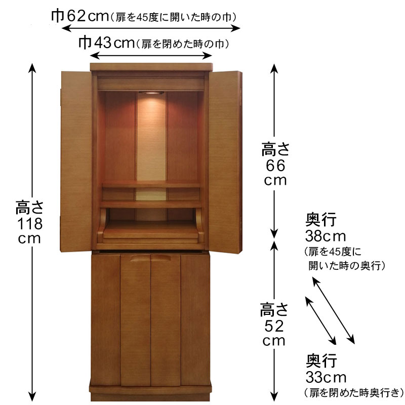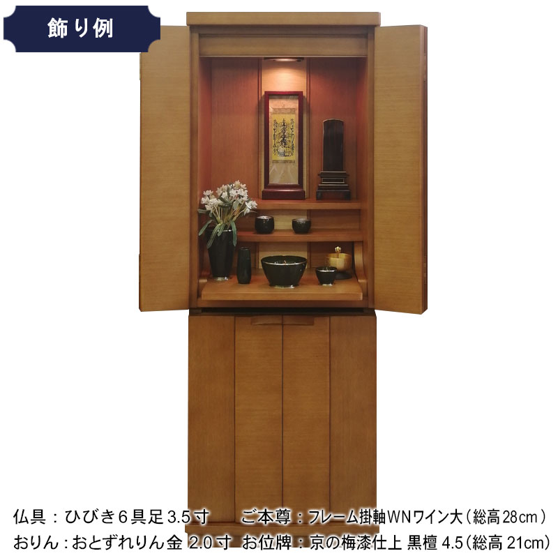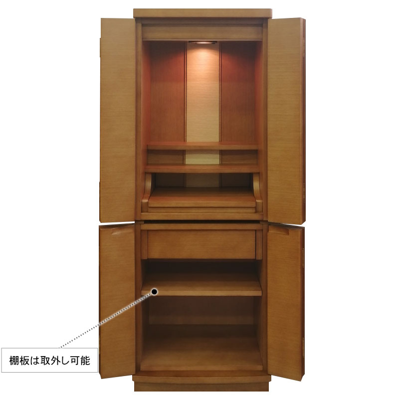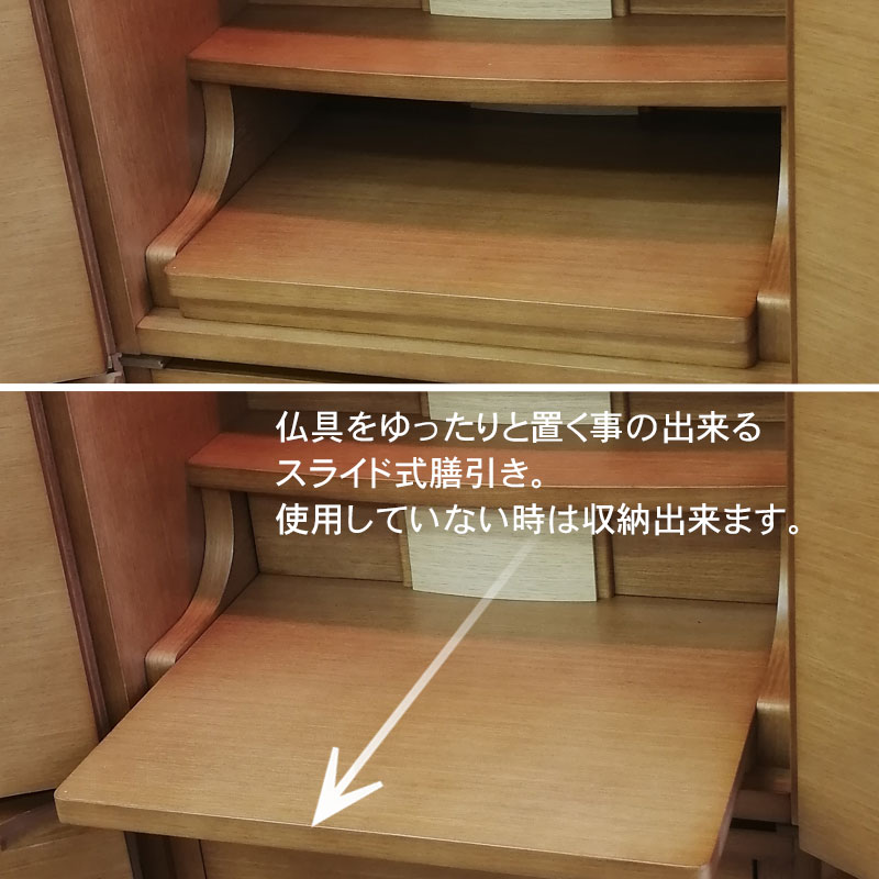 | 商品説明 | 【商品コード:3080】 ◎日本堂オリジナル商品 ■材質詳細 ・笠、台輪/主材料:タモ薄板貼り 芯材料:MDF ・戸板、扉/主材料:タモ薄板貼り 芯材料:MDF ・その他/表面仕上げ:ウレタン塗装、生産地:海外 ■宗派 どの宗派でもお使いいただけます。 ■備考 ・商品は手作りの為、一部の色、デザイン、寸法が多少変更になる場合がございます。 タモ材を表面材に使用し落ち着いた色合いで、総高さ118cmと現代の住宅事情に合わせて、台付タイプのお仏壇としてはコンパクトな40号サイズのお仏壇です。 膳引きは、スライド式となっており、お祀りいただいた仏具をそのまま中に収納して扉を閉めることができます。 下台部分には引出収納を完備し、お仏壇用品など十分な収納機能となっております。また、棚板を外すと、骨壷が収納できるスペースがありますので、納骨まで骨壺をご安置、または自宅墓としてもお使いいただけます。 内部照明には、ナツメ球を使用。暖かみのある色目でお仏壇内部を照らします。 |