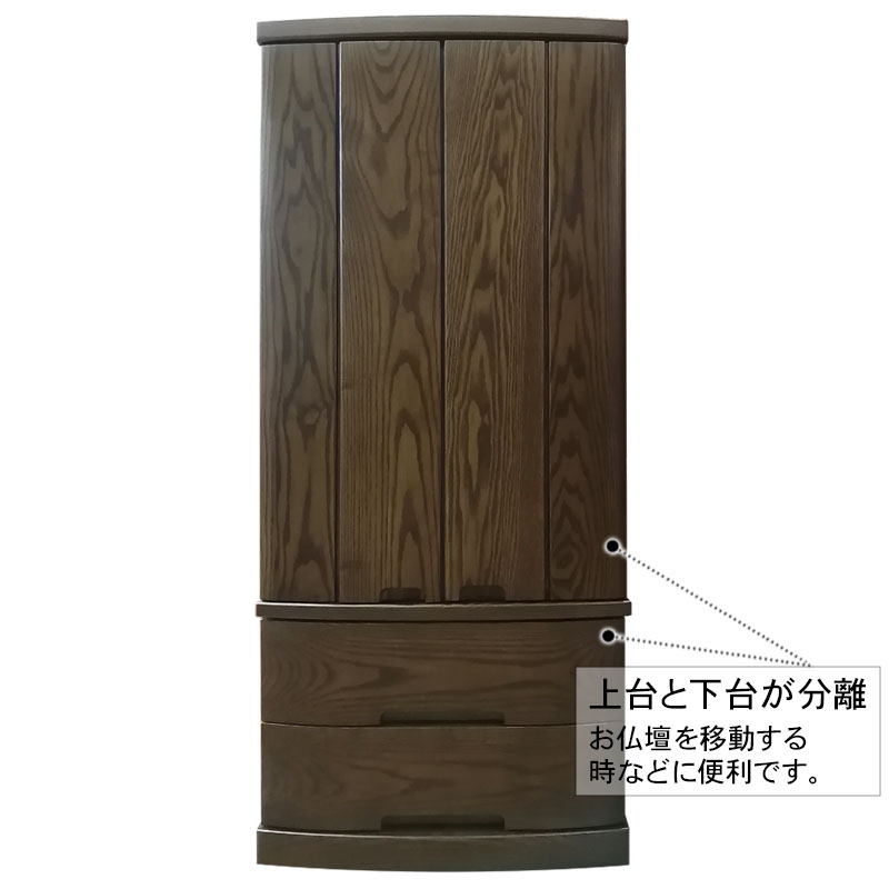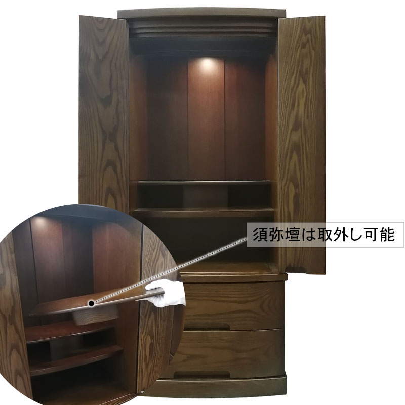 | 商品説明 | 【商品番号:3106】 ◎日本堂オリジナル商品 ■材質詳細 ・笠、台輪/主材料:タモ厚板貼り 芯材料:パーチクルボード+木質繊維版 ・戸板、扉/主材料:タモ 芯材料:タモ ・その他/表面仕上げ:ウレタン仕上、生産地:日本 ■宗派 どの宗派でもお使いいただけます。 ■備考 ・商品は手作りの為、一部の色、デザイン、寸法が多少変更になる場合がございます。 ダークブラウンの落ち着いた色目にタモの力強い木目が美しいお仏壇で、和室にも洋室にも合うデザインとなっております。 高さが115cmで台座部分が低いので正座でのお参りにちょうど良い高さです。 幅を広くとった設計で大きめの仏具もゆったりと置く事ができます。 下台には、十分な深さの引出が2つ付いており、お線香やろうそくなどの収納に便利です。 須弥壇は脱着が可能で、御本尊様の大きに合わせて調整ができます。 |