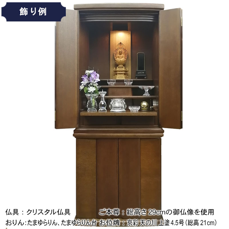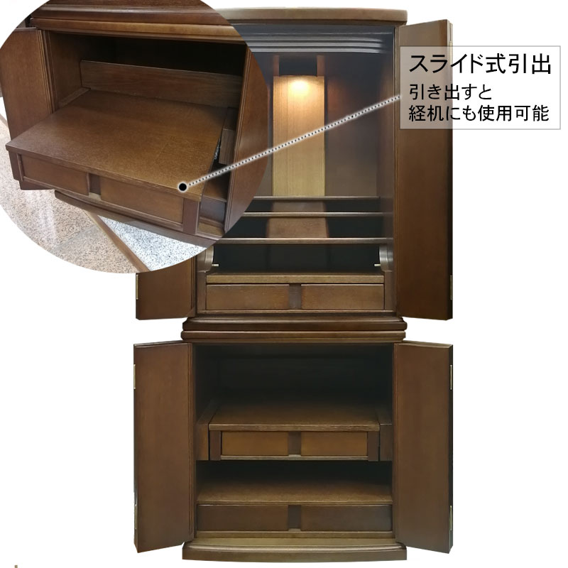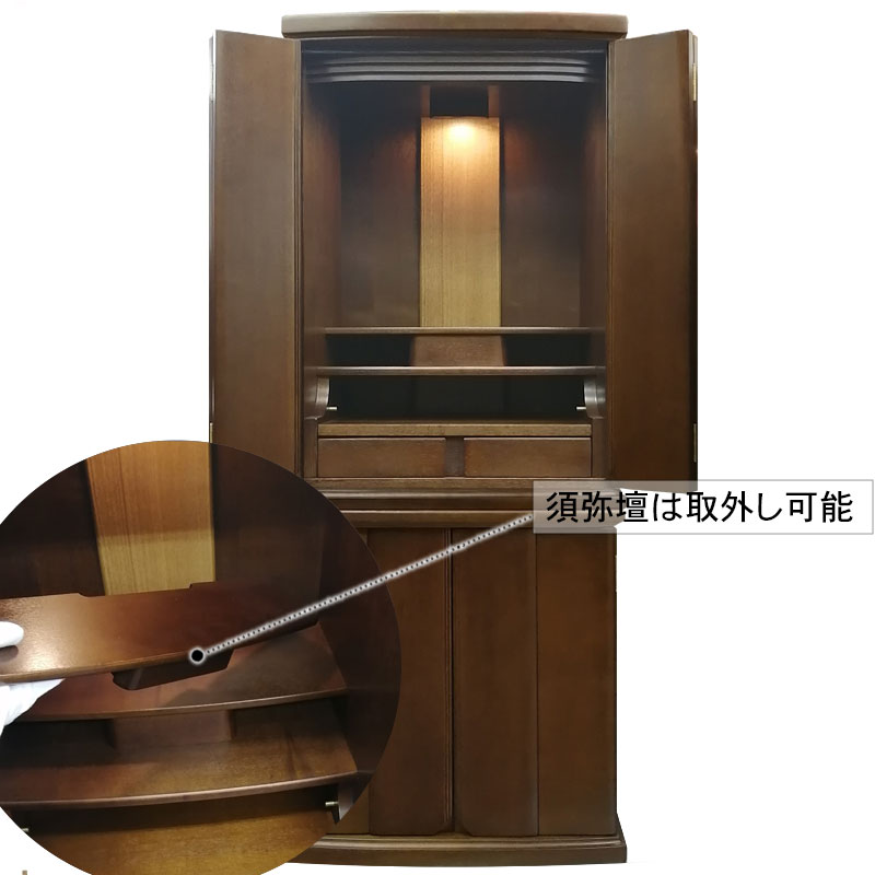 | 商品説明 | 【商品番号:3112】 ◎日本堂オリジナル商品 ■材質詳細 ・笠、台輪/主材料:タモ厚板貼り 芯材料:MDF+天然杢 ・戸板、扉/主材料:タモ厚板貼り 芯材料:MDF+天然杢 ・その他/表面仕上げ:ウレタンオープン仕上、生産地:日本 ■宗派 どの宗派でもお使いいただけます。 ■備考 ・商品は手作りの為、一部の色、デザイン、寸法が多少変更になる場合がございます。 濃い目のブラウンにスラっとまっすぐ伸びた木目が美しいモダンな家具調仏壇となっております。 須弥壇は取外し可能で、ご本尊様の大きさに合わせて調整できます。 また、下台の引出はスライド式で引き出すと経机としても使用可能です。 引出も、上台に1つ、下台に2つとたっぷり収納でき多機能なお仏壇となっております。 |