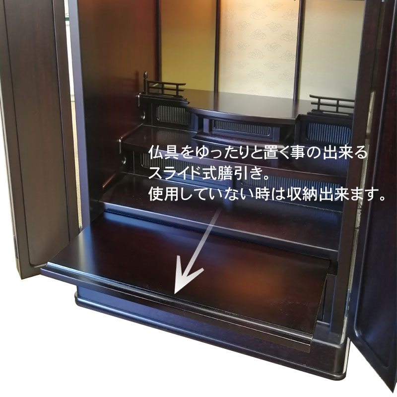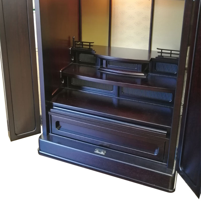 | 商品説明 | 【商品番号:3128】 ■材質詳細 ・笠、台輪/主材料:紫檀系(グラナディロ)厚板貼り 芯材料:天然木材 ・戸板、扉/主材料:紫檀系(グラナディロ)無垢 芯材料:紫檀系(グラナディロ)無垢 ・大戸軸/主材料:紫檀系(グラナディロ)二方厚板貼 芯材料:天然木材 ・その他/表面仕上げ:ウレタン仕上 オープン、生産地:日本 ■宗派 どの宗派でもお使いいただけます。 ■備考 ・商品は手作りの為、一部の色、デザイン、寸法が多少変更になる場合がございます。 他以下のサイズがございます。 ●20号:高61×幅48×奥行39cm 会津製の国産仏壇「風林火山」。 紫檀色の落ち着いた色合いに、欄間や余間などに縦の格子模様を設けたスッキリとしたデザインのお仏壇です。 背板は柄の入った金紙張りで明るい仕上がりとなっております。 高欄は小さめのマグネット式で着脱が簡単です。 また、須弥壇がせり出しているので、台座の大きい仏像もお祀りいただけます。 照明はLEDナツメ球の2灯式で、お仏壇内部を明るく照らします。 |