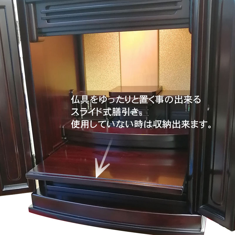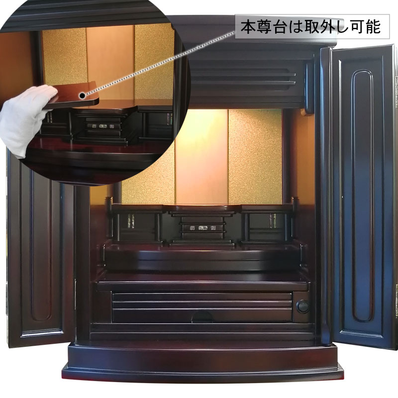 | 商品説明 | 【商品番号:3171】 ■材質詳細 ・笠、台輪/主材料:紫檀調プリント 芯材料:MDF ・戸板、扉/主材料:紫檀調プリント 芯材料:MDF ・大戸軸/主材料:紫檀調プリント 芯材料:MDF ・その他/表面仕上げ:ウレタン仕上、生産地:海外 ■宗派 どの宗派でもお使いいただけます。 ■備考 ・商品は手作りの為、一部の色、デザイン、寸法が多少変更になる場合がございます。 紫檀調を採用することで、落ち着いた色合いの中にもうっすらと見える木目が美しく 低価格ながらも高級感のあるお仏壇となっております。 また、シンプルで飽きのこないデザインが和室・洋室問わずお部屋に馴染みます。 本尊台は取外し可能となっており、ご本尊様の大きさに合わせてご使用ください。 |