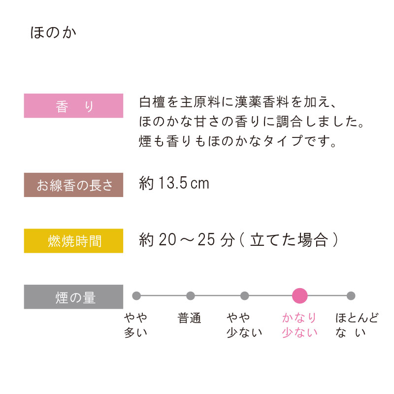 | 商品説明 | 【商品コード:3232】 ■商品詳細 ●お線香の長さ:約13.5cm ●煙量:かなり少ない ●燃焼時間:約20~25分(立てた場合) ●パッケージサイズ:長さ16×幅10×高さ3cm ※燃焼時間は、場所・気候(室内状態)により変化致します。 白檀を主原料に漢薬香料を加え、 ほのかな甘さの香りに調合しました。 煙も香りもほのかなタイプです。 |