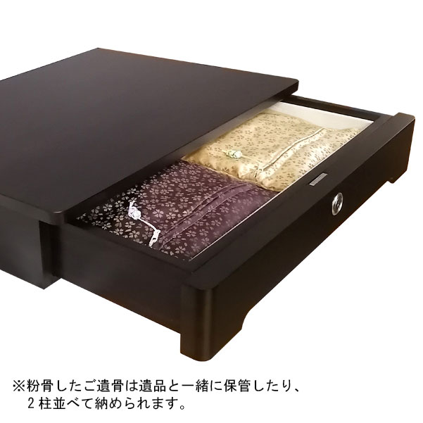 | 商品説明 | 【商品番号:3272】 ◎日本堂オリジナル商品 ご遺骨をパウダー状に粉骨し ご自宅で、故人を偲ぶことのできる新しいご供養のかたちです。 「日本堂オリジナル お参り壇」は、粉骨したご遺骨を家具のような自然な造りのお参り壇に収め、亡くなった家族を身近に感じながら、ご自宅でご供養できます。天板にはお仏壇をのせて仏教方式でお祀りしてもいいですし、供養台として故人の写真や思い出で飾るなど、伝統にこだわらない自由な形でご供養することができます。 鍵が付いているので、不用意に開けられることもありません。 開けてもすぐに中が見えないように、取外し可能な内蓋がついています。 粉骨したご遺骨は遺品と一緒に保管したり、また2柱並べて納める事もできます。 ■商品詳細 ●カラー:黒檀調 ●サイズ:高さ10×幅53×奥行39cm ※粉骨、洗骨には別途料金が必要です。 |