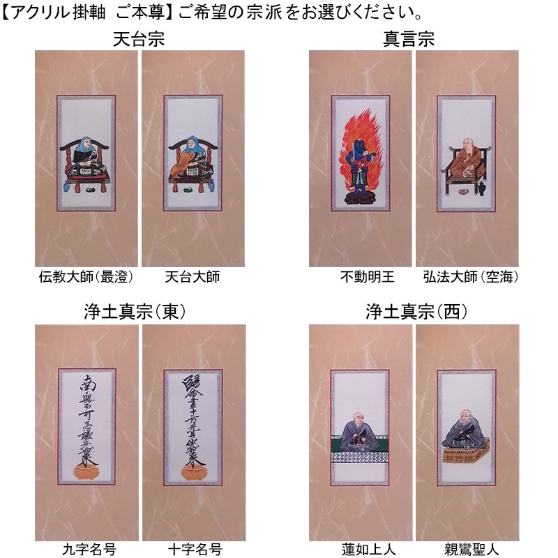 | 商品説明 | 【商品コード:3276】 ■商品詳細 ●2個セット ●サイズ: S寸: H20cm× W9cm × D3.5cm ●宗派:八宗対応(ご希望の宗派をお選び下さい) ●本紙:プリント制 ※臨済宗の脇侍セットは菩提寺様にお問い合わせいただきご指定ください(ご希望に添えない場合があります)。 家具調仏壇にもピッタリのすっきりしたデザインの脇侍用スタンド掛軸です。 お仏壇に置くだけで簡単に設置出来ます。 前面が透明アクリル板になっているため、ろうそくやお線香のスス汚れや傷を防止します。 |