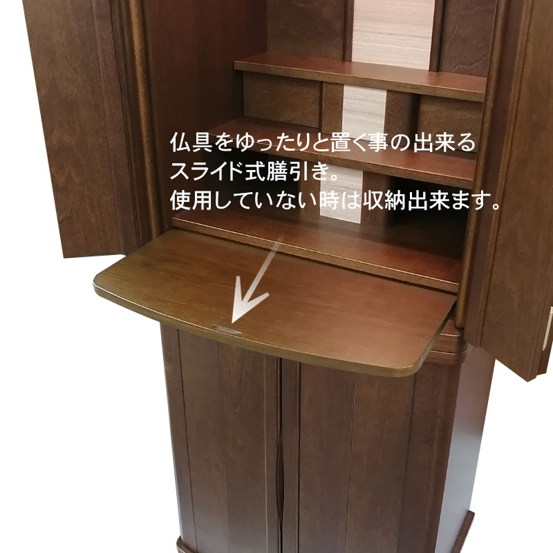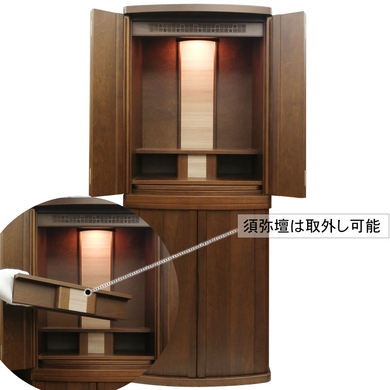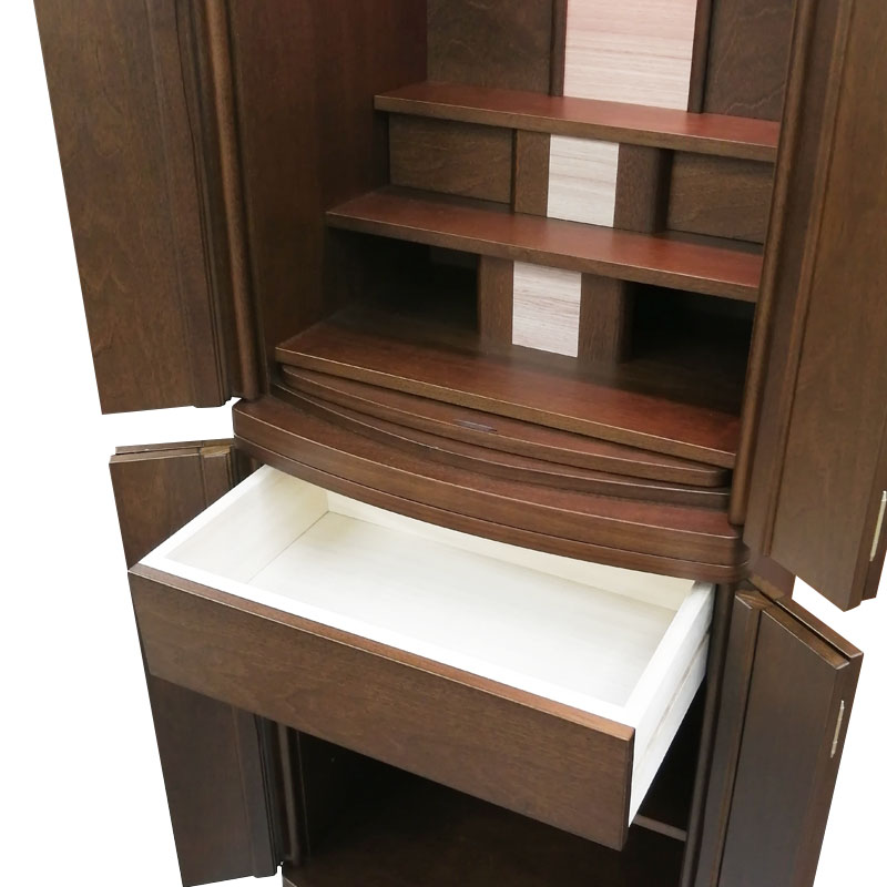 | 商品説明 | 【商品番号:3278】 ◎日本堂オリジナル商品 ■材質詳細 ・笠、台輪/主材料:ウォールナット無垢 芯材料:天然合板・MDF ・戸板、扉/主材料:ウォールナット無垢 芯材料:天然合板・MDF ・その他/表面仕上げ:ウレタン仕上、生産地:日本 ■宗派 どの宗派でもお使いいただけます。 ■備考 ・商品は手作りの為、一部の色、デザイン、寸法が多少変更になる場合がございます。 弊社の上置型仏壇の人気商品「SR」の台付型お仏壇「ドール」です。 世界三大銘木としても知られ、落ち着いた滑らかな木目が特徴のウォールナット材を使用しており、 ウォールナットの木目を活かしたブラウンで、洋室やリビング、和室にも自然に溶け込む家具調仏壇となっております。 内部の須弥壇は取り外しが可能で、ご本尊や掛軸の大きさに合わせて高さを変えることができます。 また、下台には深さがたっぷりある引出があり、お仏壇まわりの小物を収納できます。 棚板は、高さが3段階で調整でき、取り外すことも出来るので、骨壷が骨箱ごと収納可能となっております。 ライトには、光が直接目に入らないように目隠しがついています。また、欄間の花びらの彫からは、照明がうっすらともれるやさしいデザインになっています。 内部照明には、LEDライトを採用し暗いお部屋や夜間でも明るく照らします。 |