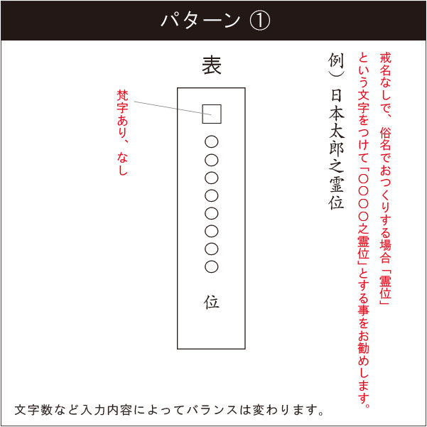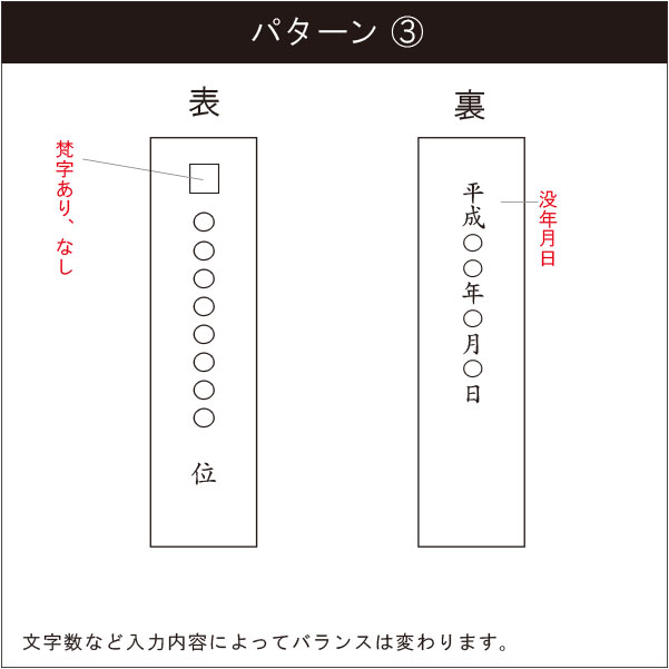 | 商品説明 | 【商品番号:3296】 お位牌本体ではありません。 必ずお位牌と一緒にご注文ください。 一度書いた文字は修正ができませんので、必ず下記をよく読んで文字の名入れをお知らせください。 【ご用意いただくもの】 戒名、没年月日、俗名(故人のお名前)、没年齢(故人の年齢)が分かる「白木位牌」「戒名用紙」を写真に撮ってご注文後メールにてお送りください。 メールはタイトルを「書き文字用、戒名・白木位牌写真」として、「注文者のお名前」「お電話番号」「今回ご購入の商品名」をご記入ください。 メールドレス sales@nihondou.co.jp 【オプション選択にて以下の内容をご入力ください】 ●ご希望納期 ●法要日 ●宗派 ●お位牌に入れる文字 戒名・法名 俗名(故人のお名前) 没年齢(故人の年齢) 没年月日 ●文字の色/表面 色、裏面 色 ●ご希望のレイアウトのパターン 【納期について】 納期は、お客様に書き文字の原稿確認をして頂き、文字確認原稿確定後「メーカー営業日の約2週間後の発送」となります。原稿の確認にもお時間を要します。余裕をもってご注文ください。 【原稿について】 基本的に弊社では「白木位牌」や「戒名用紙」に沿って原稿を作製致します。 故人の年齢の行年・享年の入れ方や戒名の下に「位」を入れるなど、先祖位牌に合わせて白木位牌より変更する場合があります。 また、以下のご説明では一般的な文字入れを記しておりますが、あくまでも一例です。どの文字を入れる・入れないというご指定は「お客様やご住職の判断」となります。事前に菩提寺やご住職にご相談の上、お入れする文字をご確認ください。 (弊社で作成した原稿を、菩提寺やご住職にご確認いただくと確実かと存じます) 【文字入れについて】 機械書きは札板に機械で箔(色のつく薄いシート)をなぞって文字を転写するので、文字はやわらかく整っている印象です。 長年使い、拭いたりしていると字が薄れていくことがあります。 【お位牌にお入れする文字】 ■戒名・法名 先代のお位牌に合わせるなど、戒名の下に「位」や「霊位」などを付ける場合は、ご入力の際に「位」や「霊位」までご入力ください。 ・真言宗は、一般的には大日如来を示す梵字の「ア」字を記入してます。 ・白木位牌に入っている「新帰元」「帰元」「新円寂」などの文字は一般的に本位牌には入れません。 ・一戒名のお値段です。二名書きより別途料金が発生します。 ■俗名(故人のお名前) ・生前の名前を入れ、一般的には名前の上に「俗名」と記入します。 ■没年齢(故人の年齢) 没年齢を記載の際は、以下の点をご注意ください。 ・先祖位牌に「行年」とあり、白木の位牌に「享年」とある場合等、先祖位牌に合わせて行年・享年を変更する場合があります。お寺様によって没年例の数え方が違うので、ご不明な点は菩提寺やご住職にお尋ねください。 記入例)「行年〇〇才」「行年〇〇歳」「享年〇〇才」「享年〇〇歳」「(行年・享年を付けない)〇〇才」「(行年・享年を付けない)〇〇歳」「(その他の文言)〇〇才」「(その他の文言)〇〇歳」「行年〇〇(才・歳を付けない)」「享年〇〇(才・歳を付けない)」等々 ■没年月日 亡くなった日を記入します。 ・白木の位牌の年月日の下に「没」「寂」などの文字が書かれている場合は一般的には省きます。 【梵字について】 梵字は、真言宗なら「ア」・浄土宗なら「キリーク」・浄土真宗なら「法名」など、宗派により異なり、さらに地域によっては入れない場合があるなど様々です。 ご不明な点は菩提寺やご住職にお尋ねください。 【文字の色について】 一般的には全て金色です。 ・金・朱・白・群青(位牌の札板の表が総金の場合)の4色からお選びいただけます。 ・表面:金文字が一般的です。 ・裏面:金文字が一般的です。 関東圏では、裏面に俗名・行年を入れて朱色を使う事が多いようです。 【家紋入れ】 家紋をお位牌に入れることでそのお家を表し、格式高くなります。 ・家紋入れは別途料金が発生します。 ・家紋部分は「書き」のみの対応になります。 |