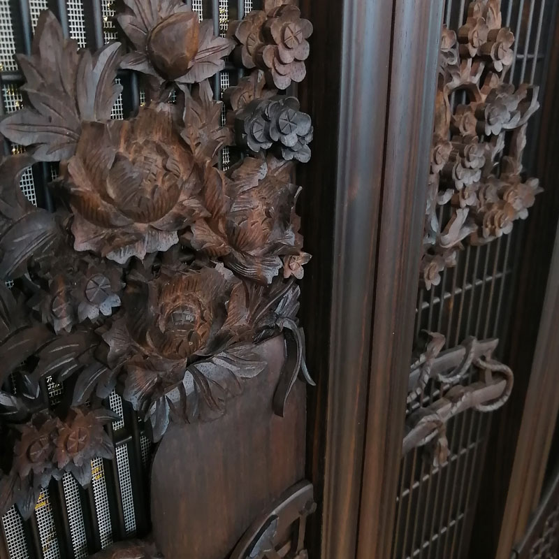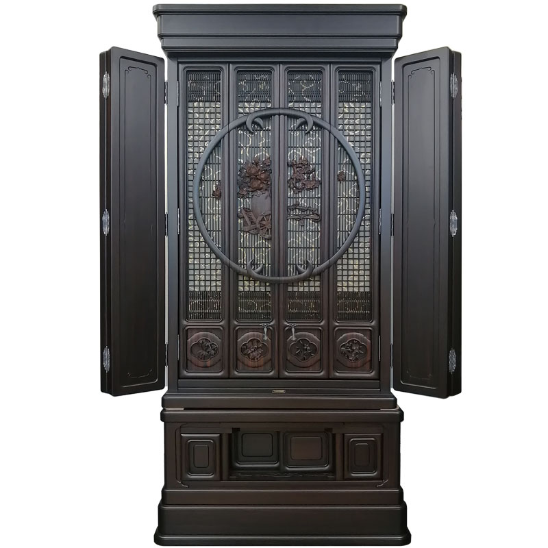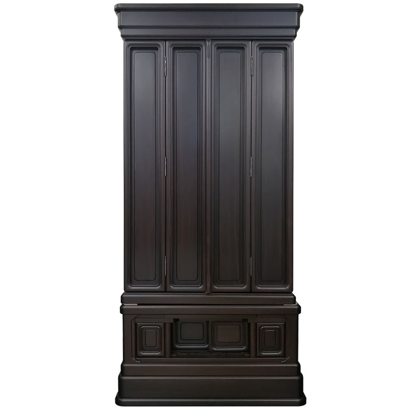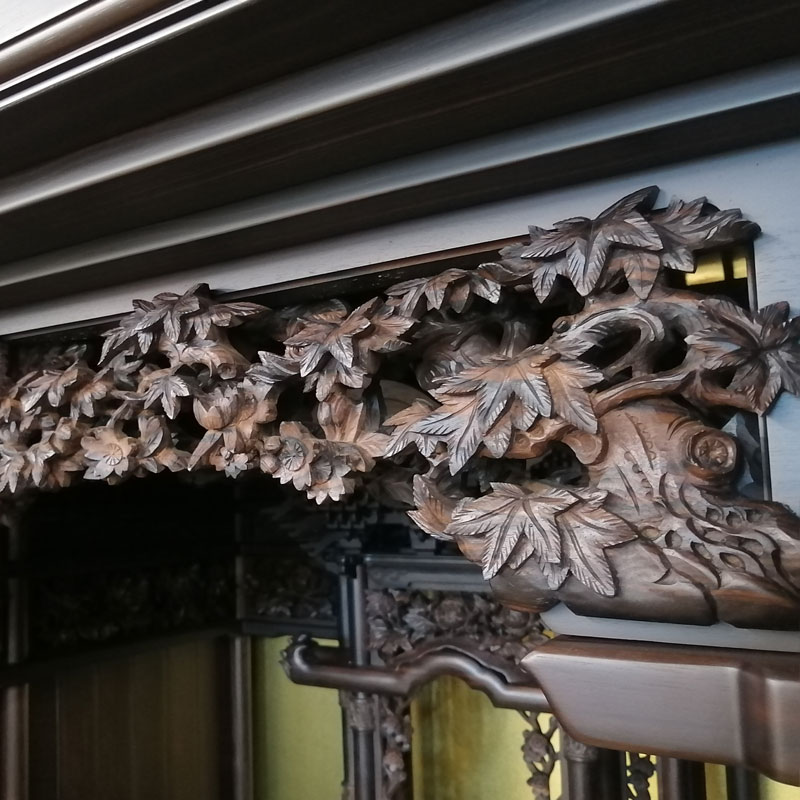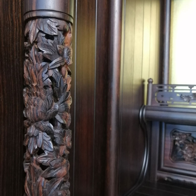 | 商品説明 | 【商品コード:3317】 ■材質詳細 ・笠、台輪/主材料:本黒檀厚板貼り 芯材料:ニヤトー ・戸板、扉/主材料:本黒檀無垢 芯材料:本黒檀無垢 ・大戸軸/主材料:本黒檀厚板貼り(四方練り) 芯材料:ニヤトー ・その他/表面仕上げ:ウレタン仕上、生産地:海外 ■宗派 どの宗派でもお使いいただけます。 ■備考 ・商品は手作りの為、一部の色、デザイン、寸法が多少変更になる場合がございます。 お仏壇の材料としては、最高級木材の本黒檀を使用した58/25号サイズのお仏壇です。 黒檀がもつ独特の縞模様が美しく、硬い木質に緻密な木肌が特徴となっております。 独立した造りの「置き宮殿」は取り外し可能で 天井部分は、折り上げ格天井に花丸彫り彩色をあしらった逸品となっております。 また、障子部分には、花車と東洋画では古代より草木の中の君子と称えられる4種の草木「蘭」「竹」「菊」「梅」の「四君子」彫が施されております。 |